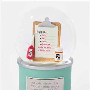 • Snow globe celebrating nurses featuring a clipboard checkllist, thermometer, and prescription inside