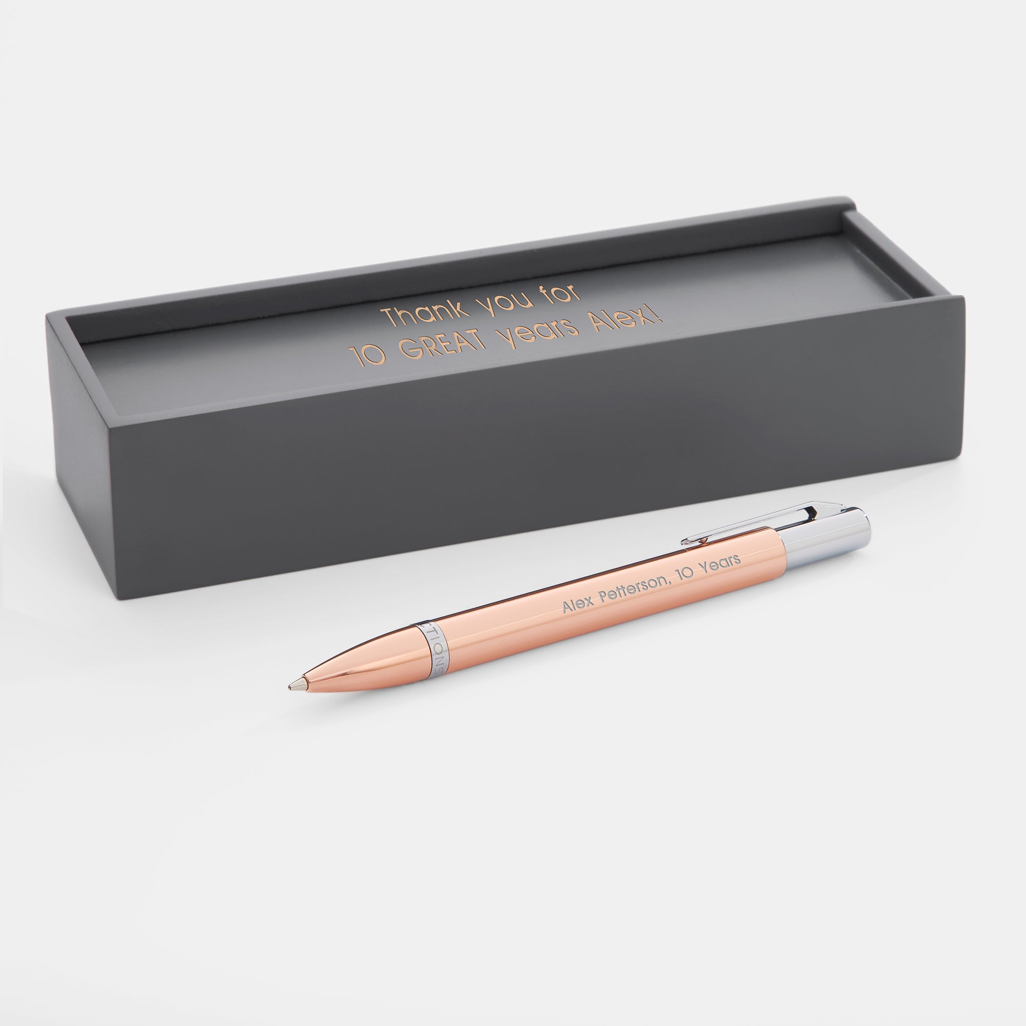 - Rose gold pen with chrome silver accents, presented in grey wooden gift box