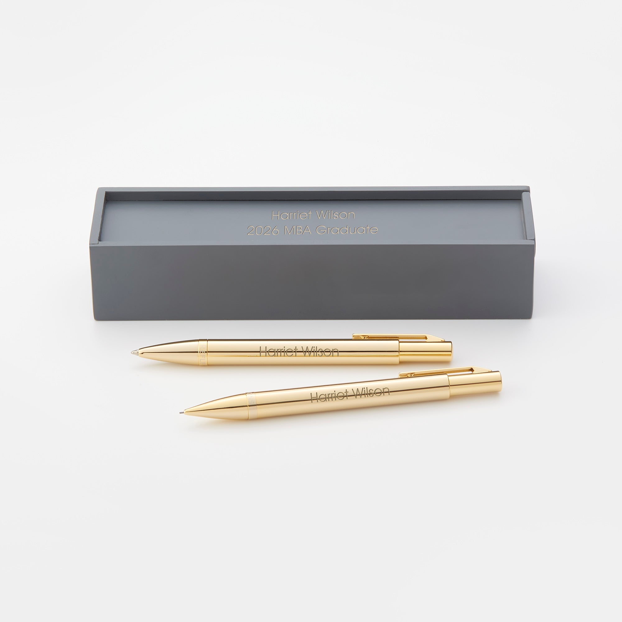 - Set of matching gold ball point pen and mechanical pencil in grey wooden gift box