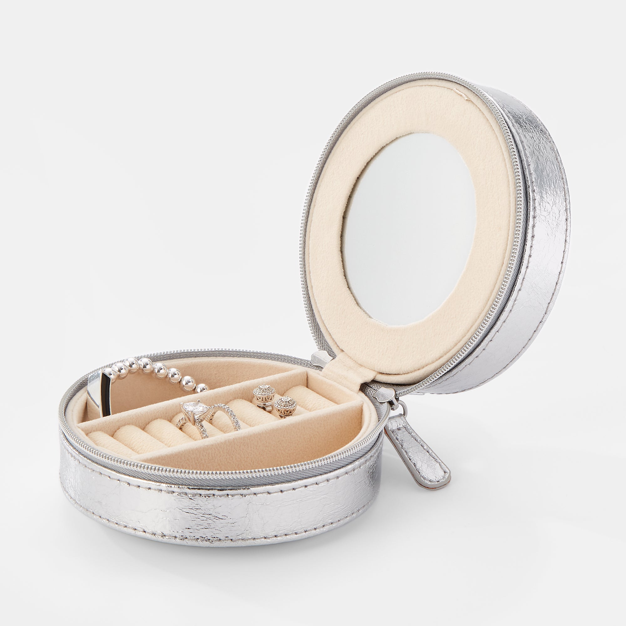 - Travel-friendly round jewelry box in silver crackle vegan leather
