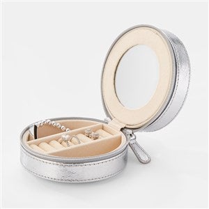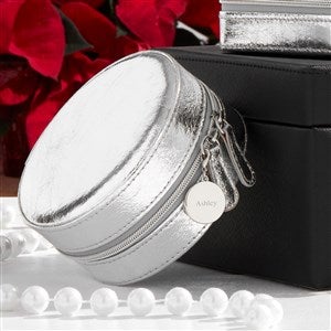 If they love accessorizing, our Engraved Round Jewelry Box and Travel Case is for them! This handy silver vegan leather case easily transports their spare watch, jewelry, and accessories for any trip! It can also be used for small cords and tech items back and forth from the office. Whether its local or international, their necessities are close at hand and organized. They'll love how easy it is to pack and the personalization on the zipper pull pendant! We'll engrave it with your choice of name, initials, or short message.