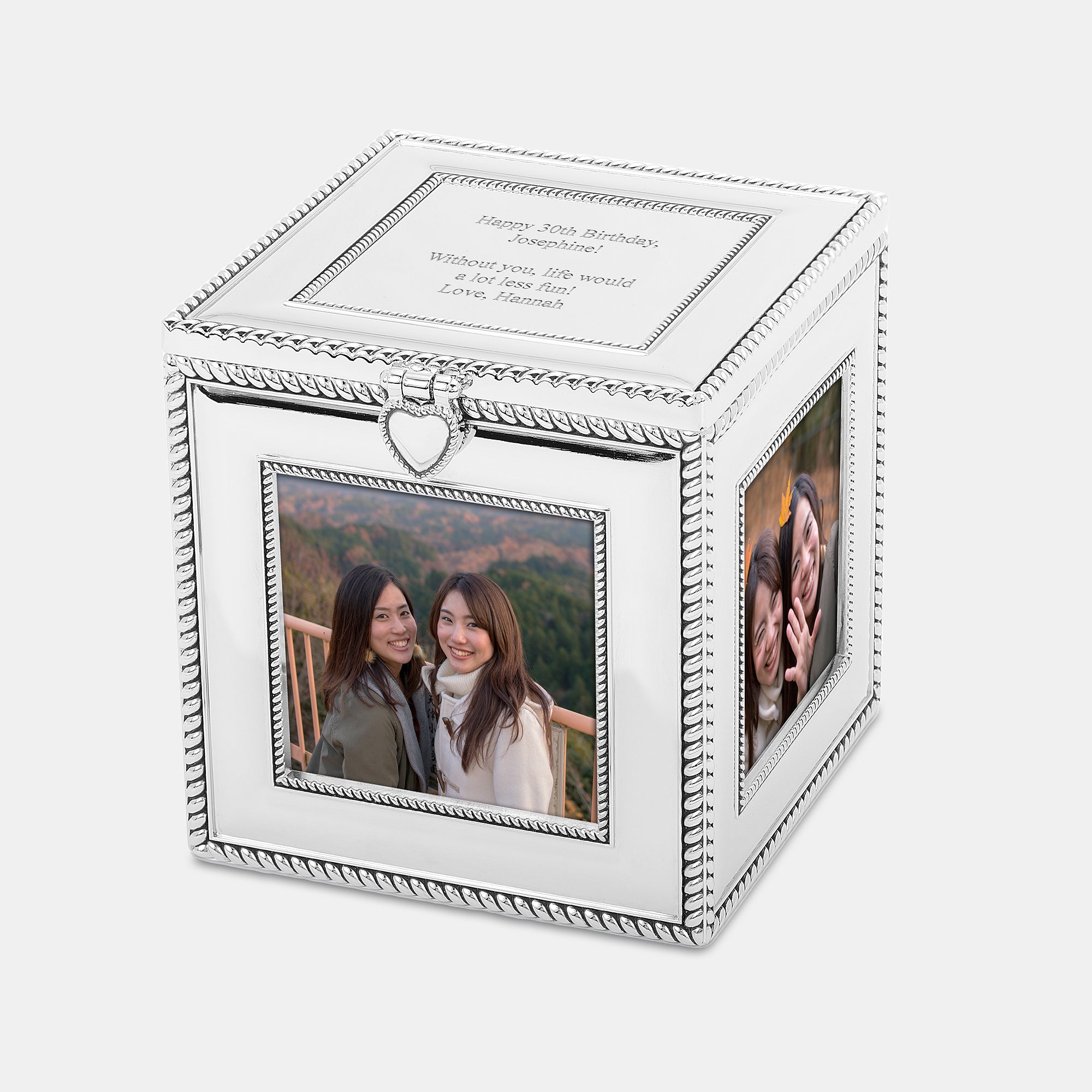 Our Silver Cube Frame and Keepsake Box provides a unique way to display photos and store their favorite small accessories. They'll love the ability to switch up the photos and display their favorite moments to remember!