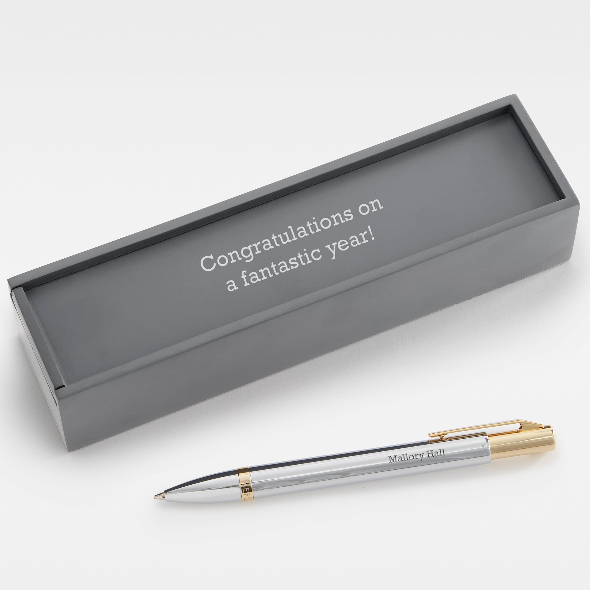 - Personalize with up to 25 characters on the pen and up to 2 lines of text on the grey box, in your choice of fonts