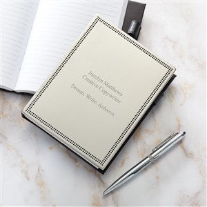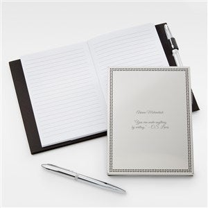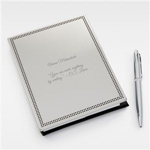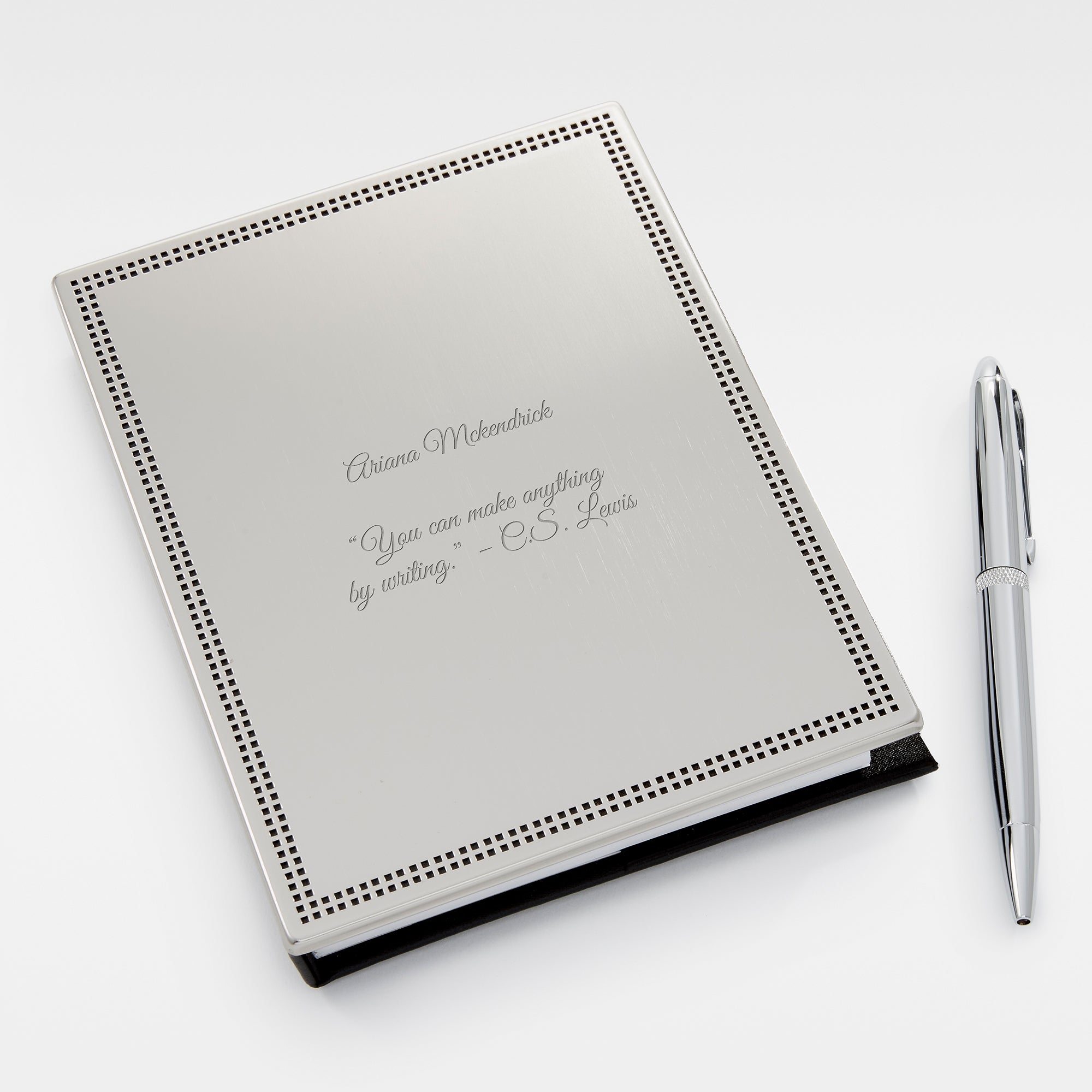 Our Engraved Silver Metal Journal makes a great gift for graduations, promotions, new jobs, and more! It comes with a silver ink pen, and the front of the cover can be engraved with a message of your choice. We recommend their name, title, or a short sentimental message for them to look at every time they need to take notes! We also offer this journal and pen set in black.