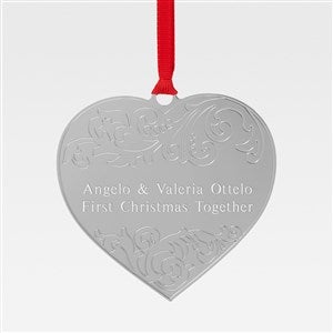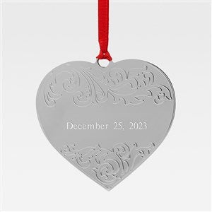 Our Silver Heart Ornament features a swirl stamped design and can be personalized with the sentiment they'll love to see on their tree for years to come. This silver-tone metal can be engraved on the front and back with up to 3 lines of text in your choice of font. This ornament makes a great family, hostess, or office holiday gift!