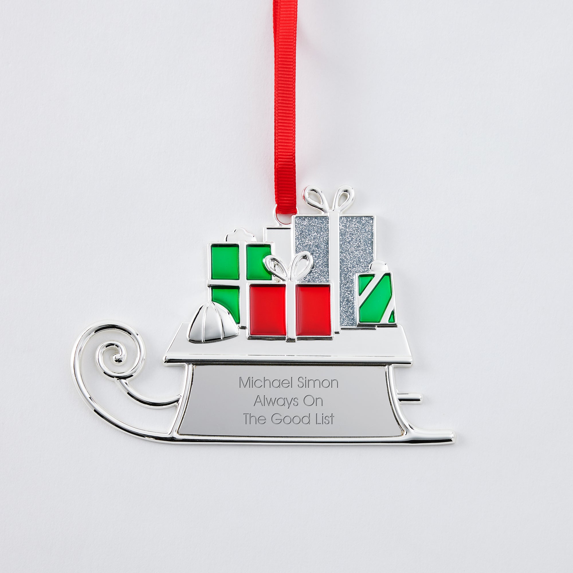 Product Information 51327 - Engraved Silver Sled with Presents Metal Ornament