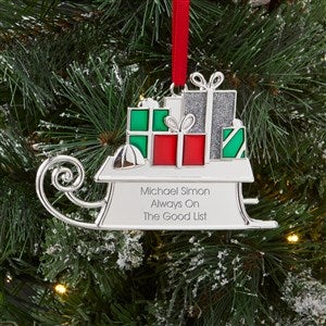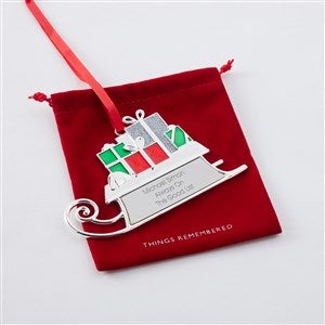 The Engraved Silver Sled with Presents Metal Ornament will be loved by adults and kids in the family! With a festive and classic design, it makes a perfect gift or addition to your family tree. This silver-tone metal can be engraved with up to 3 lines of text in your choice of font. This ornament makes a great family, hostess, or office holiday gift!
