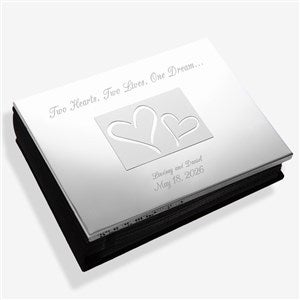Our Love Ever After Personalized Wedding Photo Album is ideal for the happy couple to showcase photos from engagement parties, bridal showers, rehearsal dinners, and all the romantic and memorable moments of their engagement and wedding. Beautifully crafted of shimmering silver-plate featuring two hearts artistically reversed engraved against a matte silver canvas, symbolizing their two hearts sharing one dream ahead.
