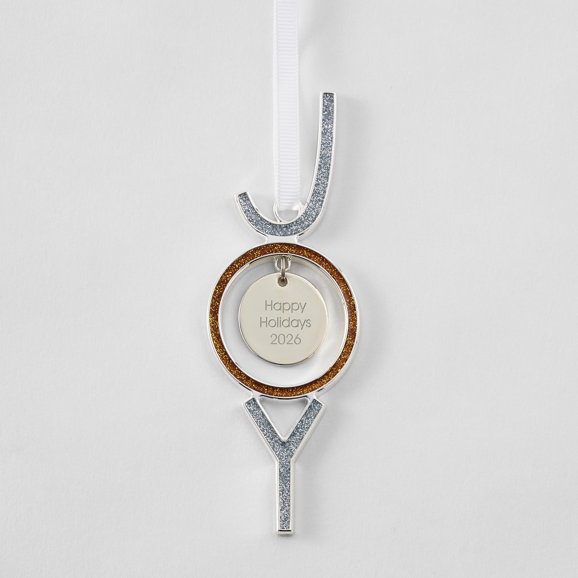 - Silver 2D 'Joy' ornament with sparkly gold and silver accents