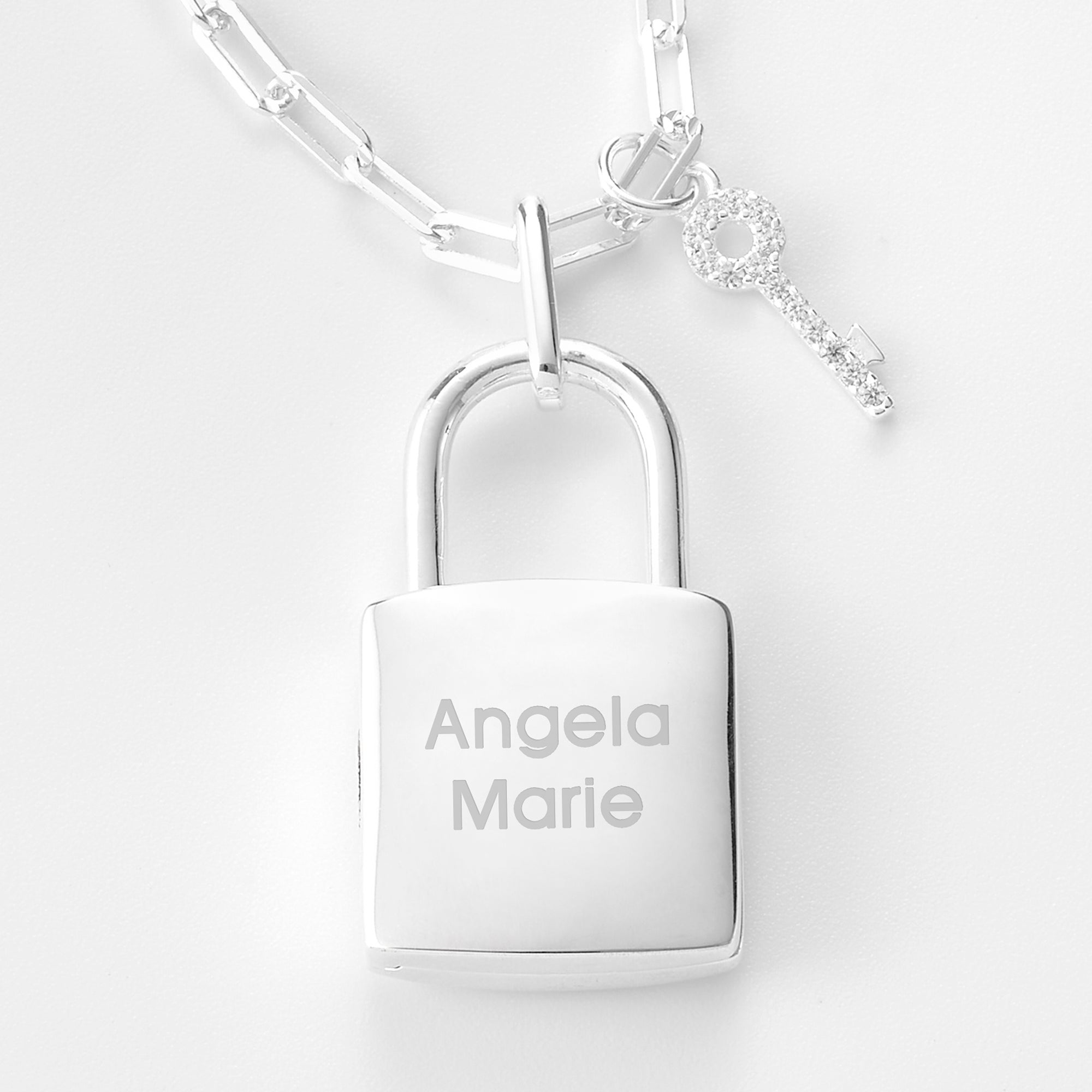 Our Sterling Silver Locket and Key Necklace is a fun spin on the traditional locket. The "lock" pendant opens to display a photo and the "key" has pave crystals. For the jewelry-lover in your life, we'll engrave their name, initials, or date on the front and back.