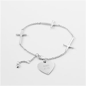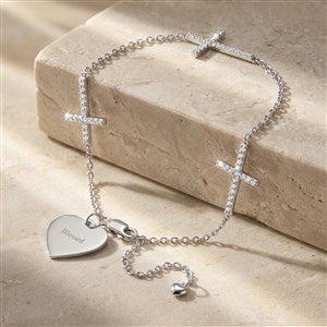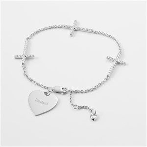 - Sterling silver bracelet with pave crosses stationed around bracelet and heart charm for engraved message