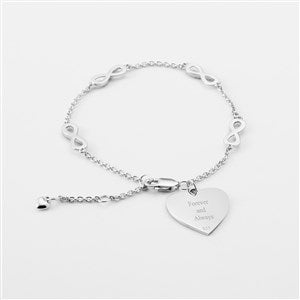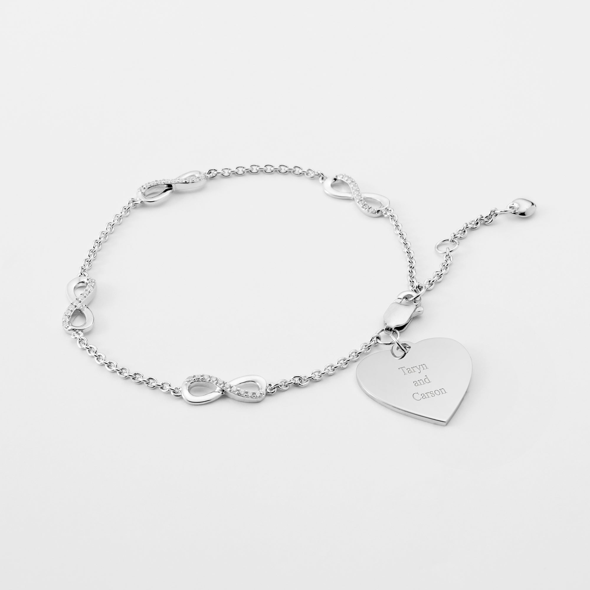 • Sterling silver bracelet with pave infinity symbols stationed around bracelet and heart charm for engraved message