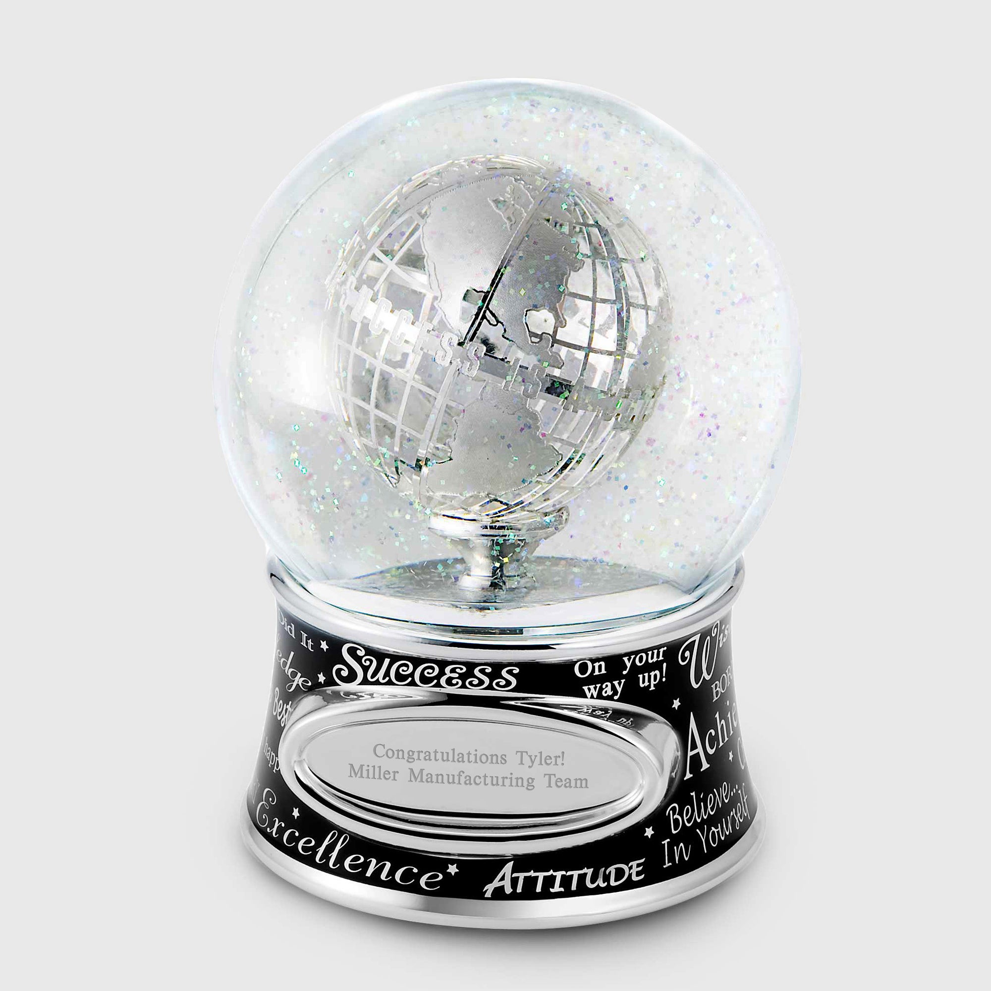 The Success Recognition Snow Globe celebrates their achievements with movement! Give this a quick wind up and see the globe inside spin while it plays "The Impossible Dream". The equator of the globe is inscribed with "Success is not a destination". We'll engrave it with their name, date, achievement or personal note.