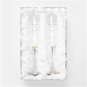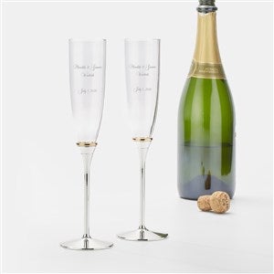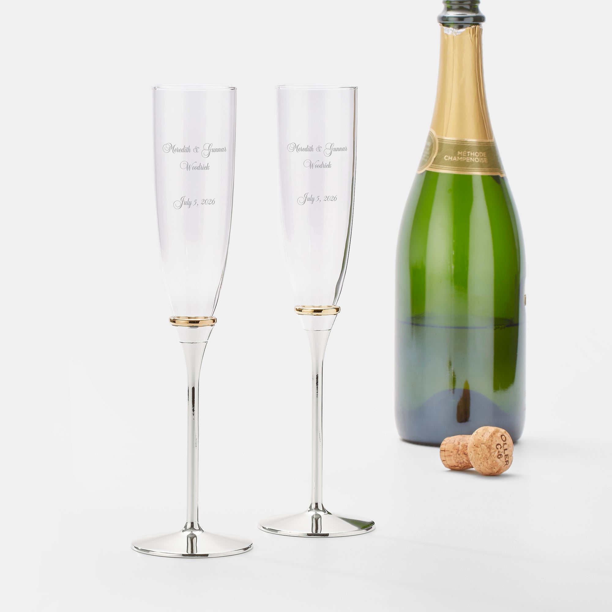 - Flute set with silver metal stems and base with thin gold band detailing where the glass attaches to the stem.