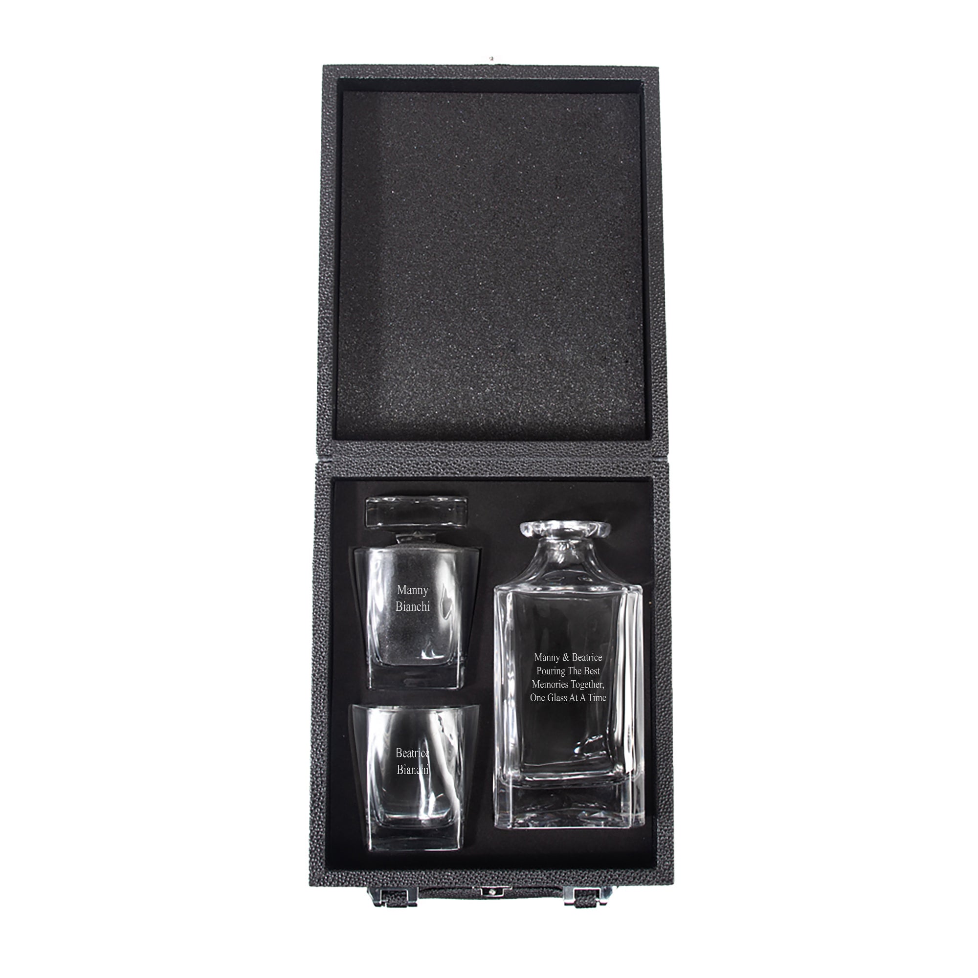 • Engrave the decanter with up to 6 lines of text and each glass with up to 4 lines of text