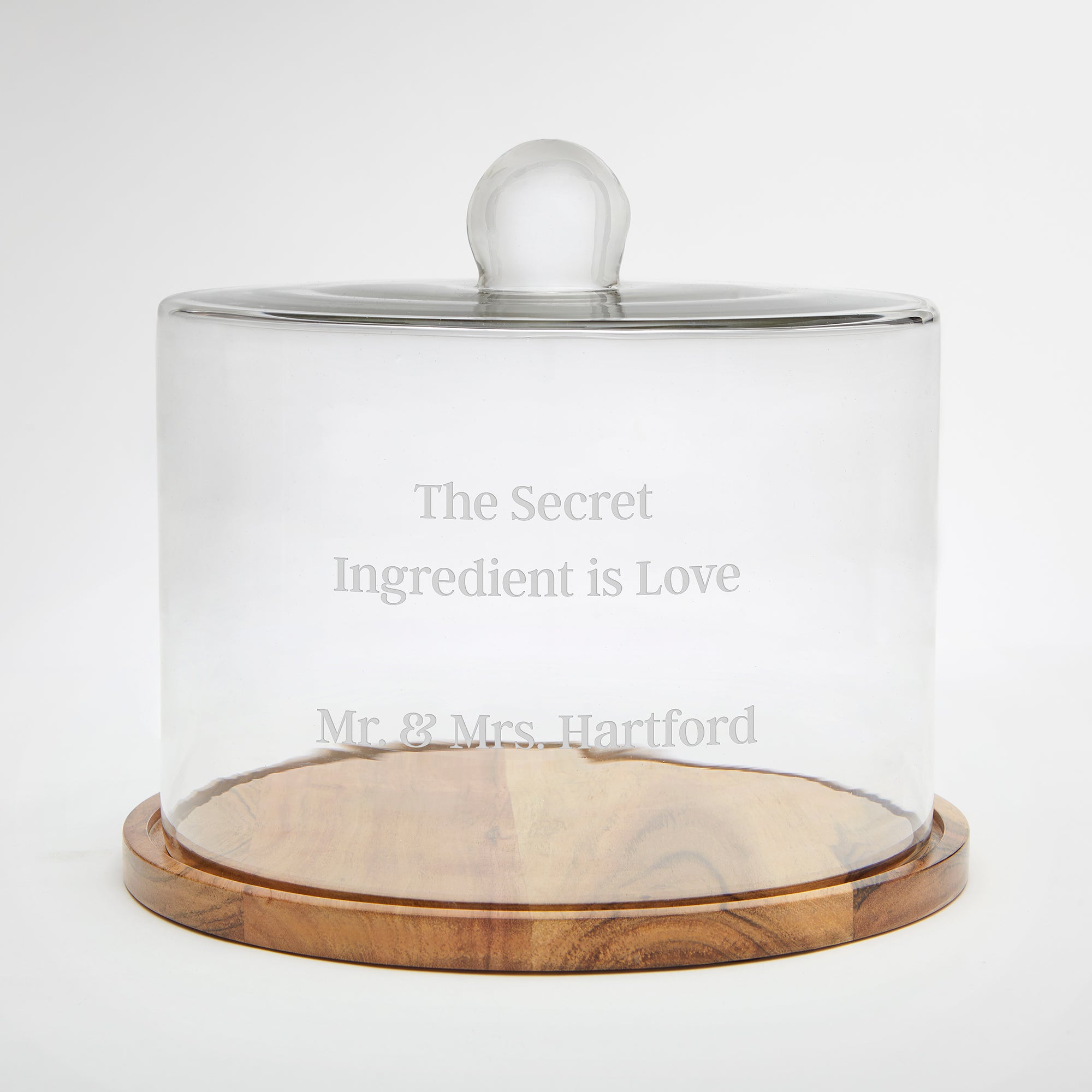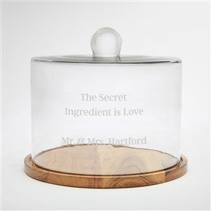 The Engraved Wedding Cake Dome with Acacia Wood Base is perfect for serving and displaying desserts and cheese or even using as décor. The newlywed couple will enjoy entertaining with this beautiful set engraved just for them.