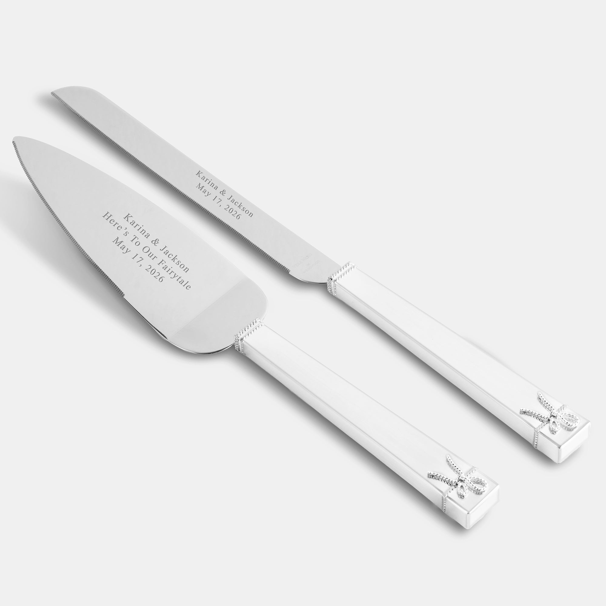 - Personalize with up to 3 lines of text on cake server and 2 lines of text on cake knife in your choice of font