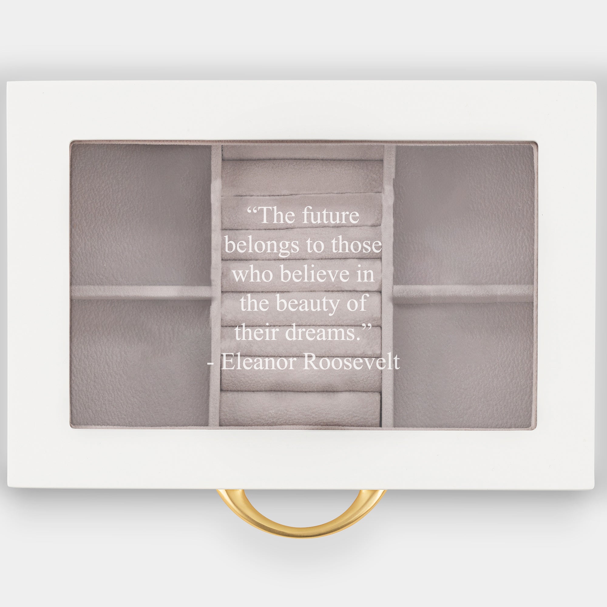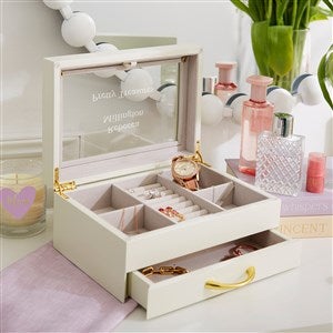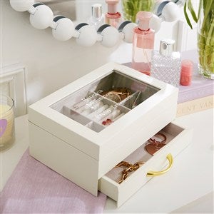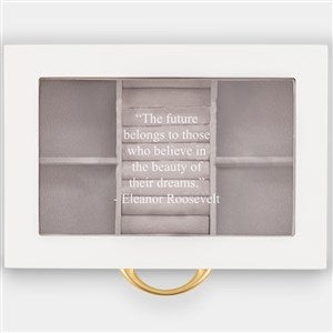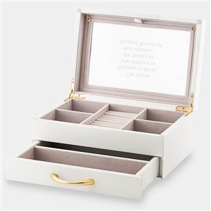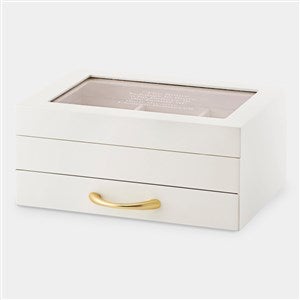 Our Engraved White Wood Jewelry Box will conveniently store and organize all of her favorite accessories. The gold accents and glass plate add an elegant touch to the design. Make it more personal by having their name, birth date, or a short message engraved on the glass plate.