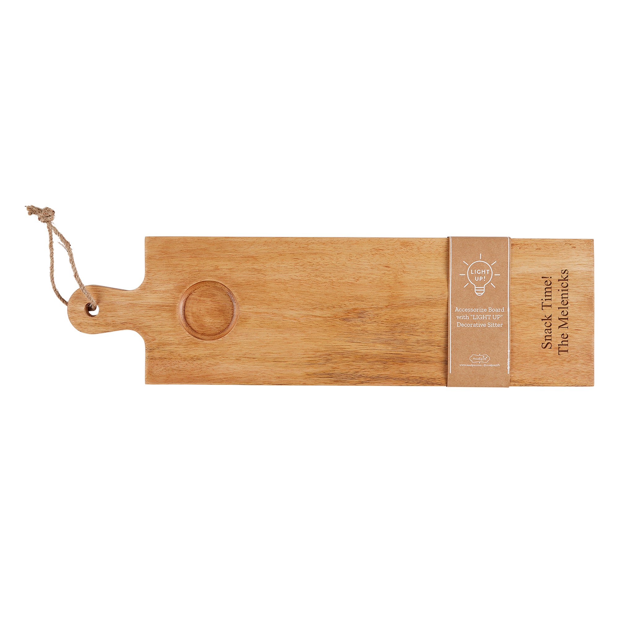 - Wooden serving board with special cutout to display light up sitter for the occasion