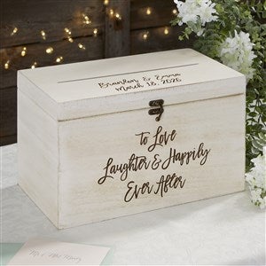 Our Ever After Personalized Wedding Wood Card Box is the perfect gift for any bride-to-be. Her special day will be a day to remember with this precious keepsake engraved with the quote "To Love Laughter & Happily Ever After" on the front of the card box.