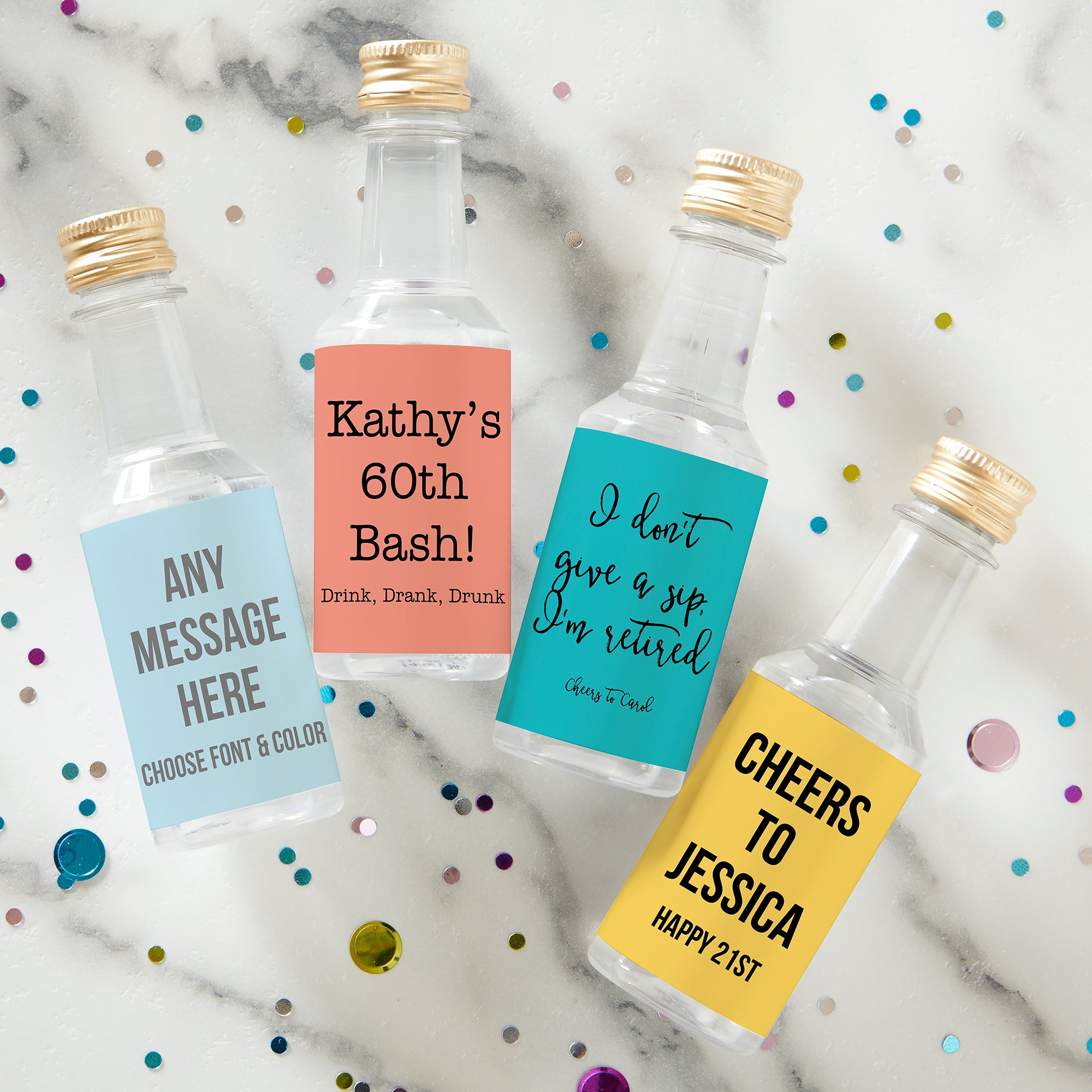 Get the party started with our Expressions Personalized Mini Bottle Liquor Labels. The perfect and universal favor for any occasion such as bachelorette, birthday, or graduation!