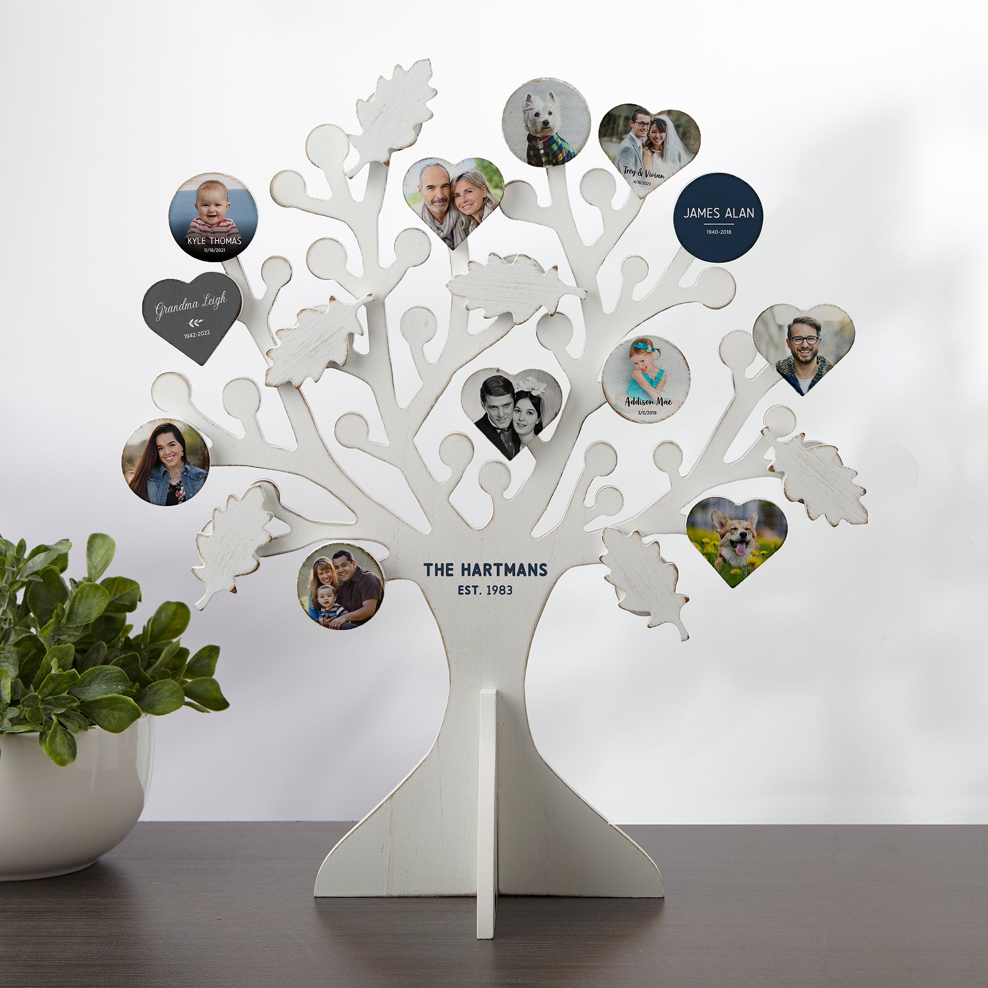 The Family Name Personalized Magnetic Wooden Family Tree is a beautiful way to display the members of the family you love. The magnetic branches hold up to 18 of our round, heart or leaf magnets (sold separately).