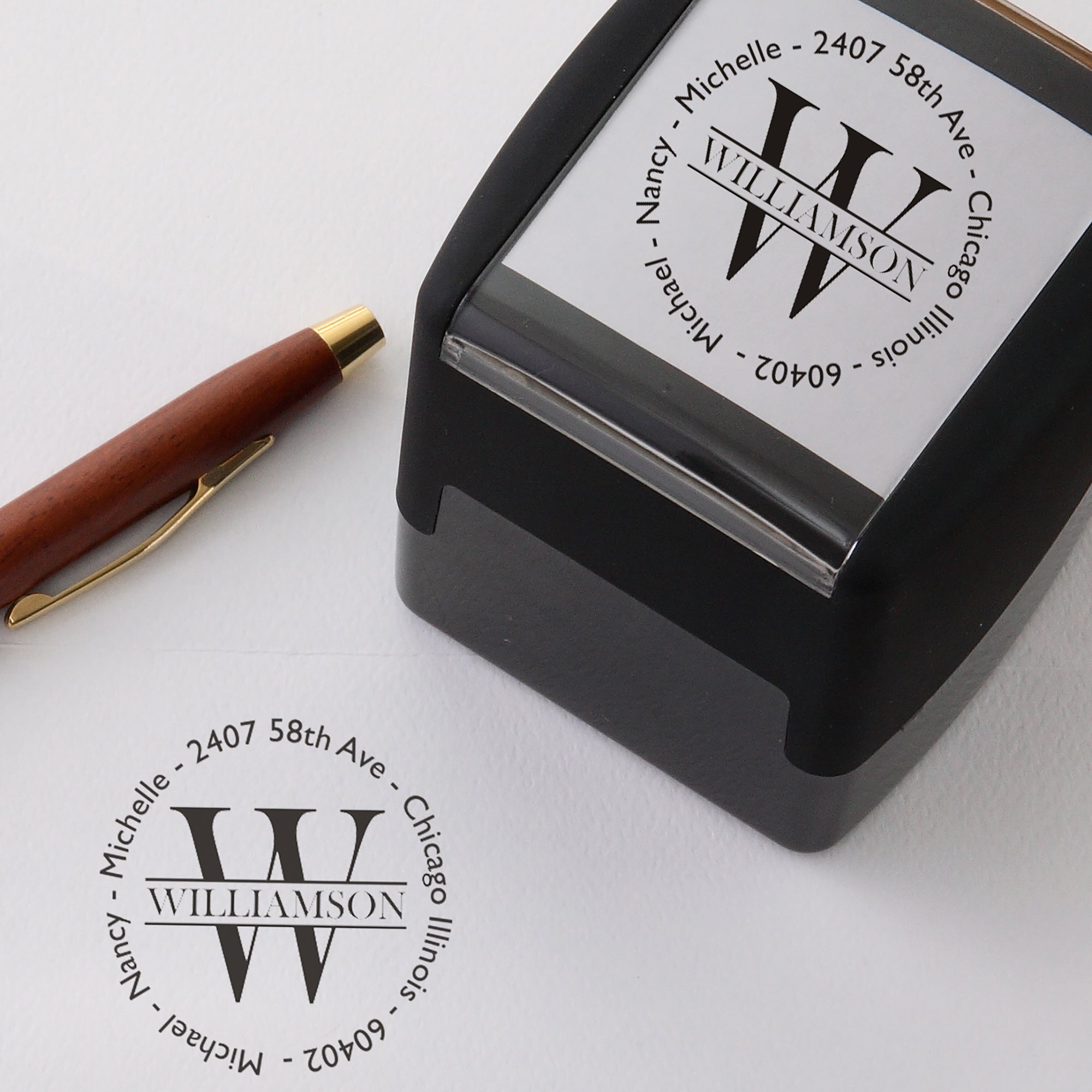 • This handy stamper features your last name and initial in the center, surrounded by address and individual family member names, as shown.