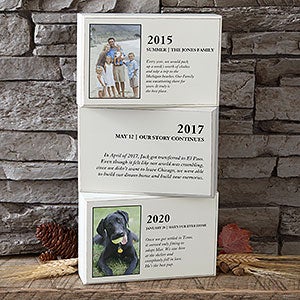 Decorate any shelf or mantel and highlight special moments in your life with the Family Story Personalized Shelf Blocks. Available in both photo and non- photo layouts.