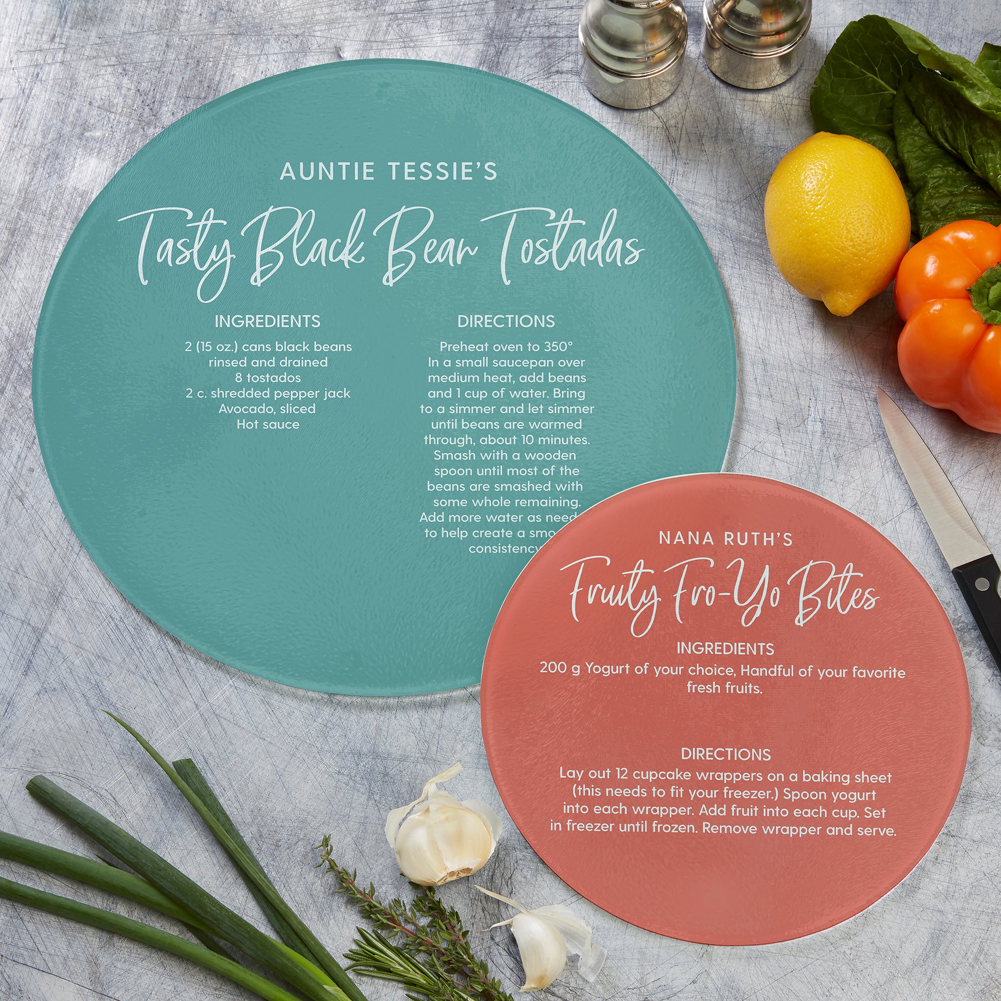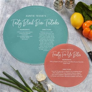 Fun and functional our Favorite Family Recipe Personalized Round Glass Cutting Boards are great for prepping, serving or for counter decoration. These glass cutting boards feature a sturdy tempered glass body that is shatter-resistant, and will prove to be a great counter saver.