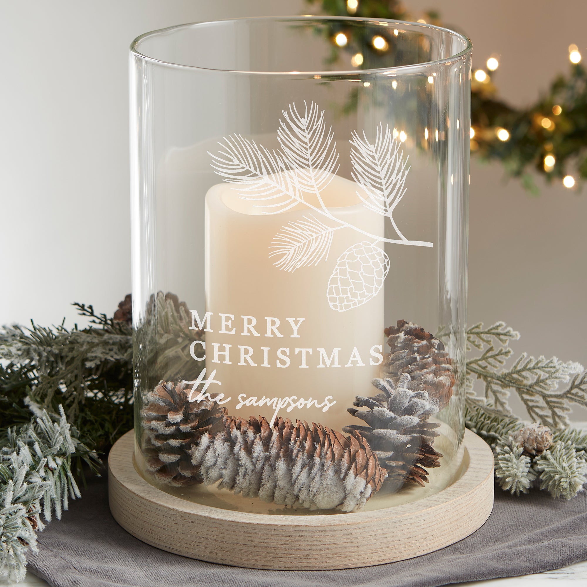 Festive Foliage Personalized Christmas Hurricane with Whitewashed Wood Base