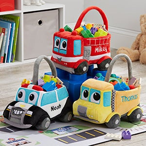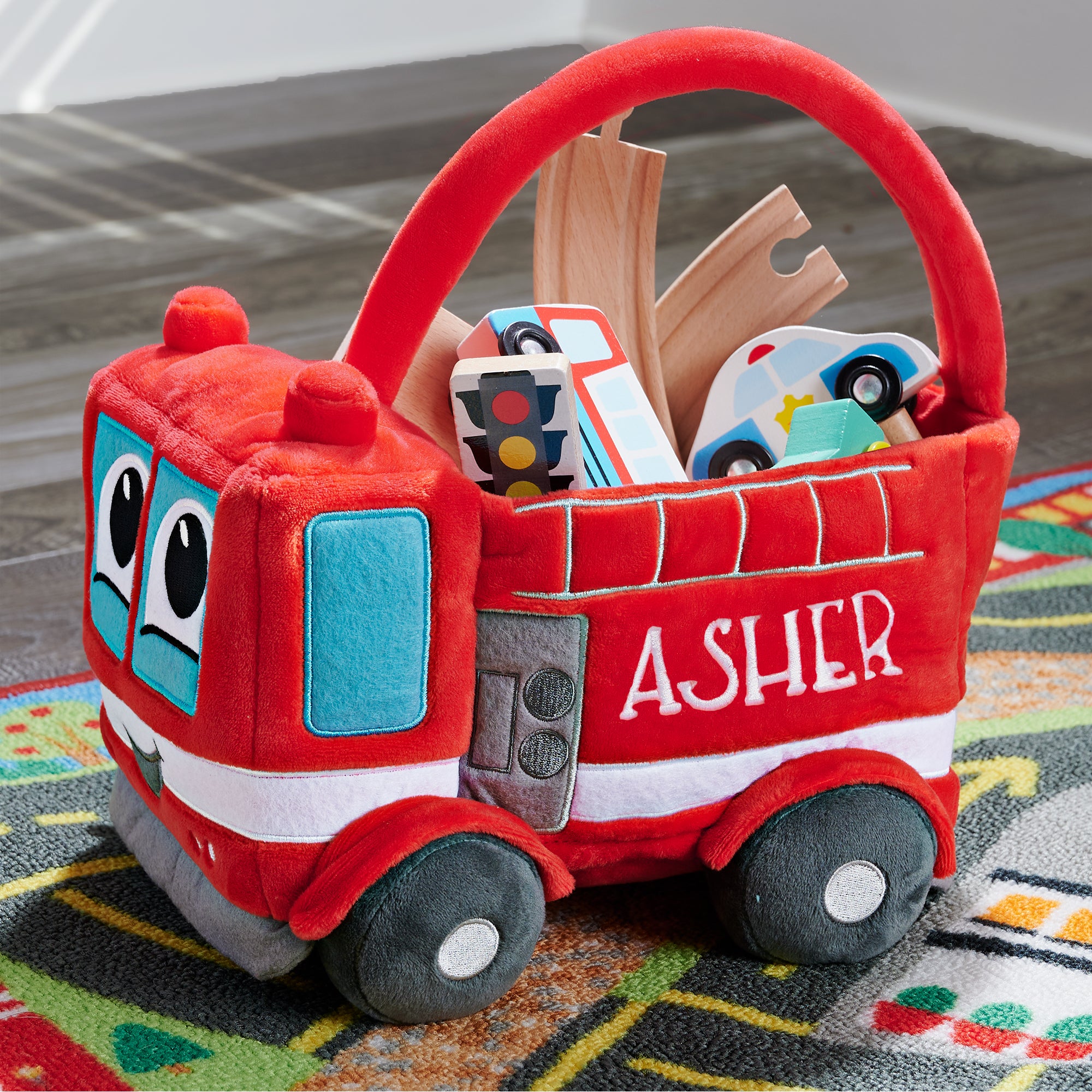 The Fire Truck Embroidered Plush Toy Storage Basket is the perfect treat bag for any little one's collection. The personified fire truck features an adorable face and embroidered details, including a hose and ladder.