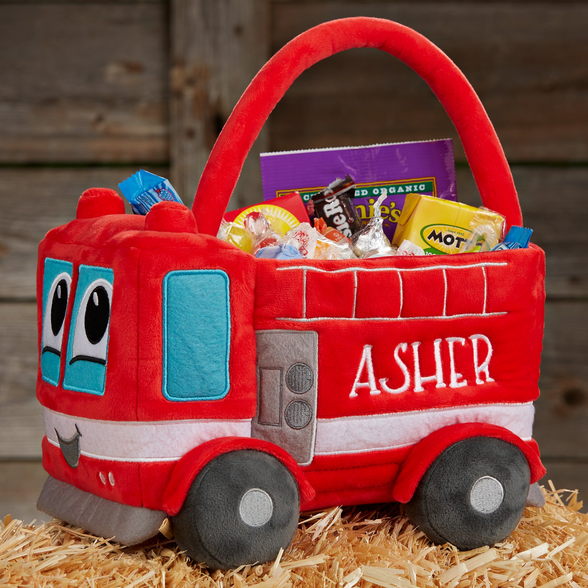 The Fire Truck Embroidered Plush Halloween Treat Bag is the perfect treat bag for any little one this Halloween. The personified fire truck features an adorable face and embroidered details, including a hose and ladder.