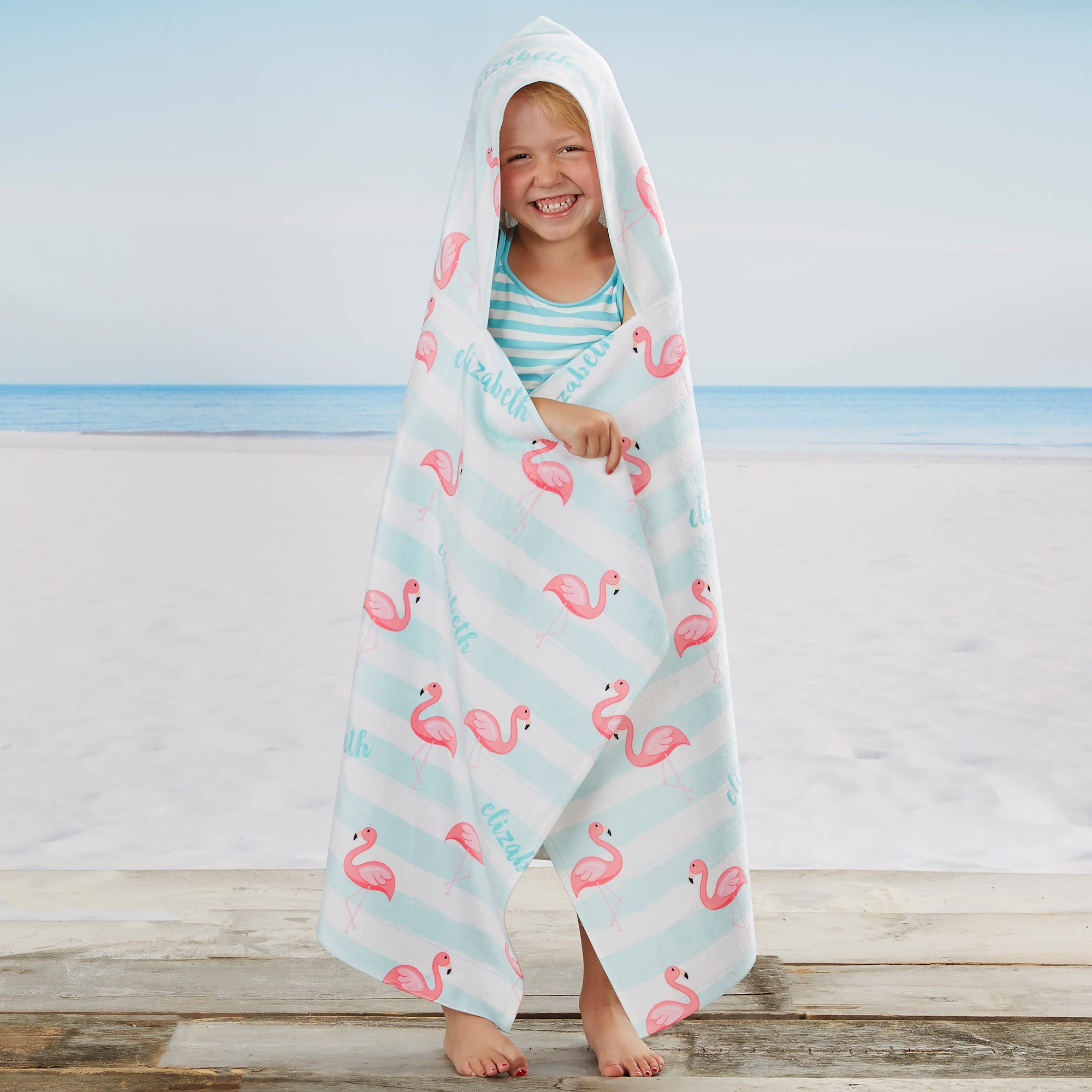 Make a splash at the beach or pool with our Flamingo Personalized Kids Hooded Beach & Pool Towel. The hooded design keeps your child's head from getting cold while the terry material takes away the moisture left over after getting out of the water, keeping your child snuggled in comfort.