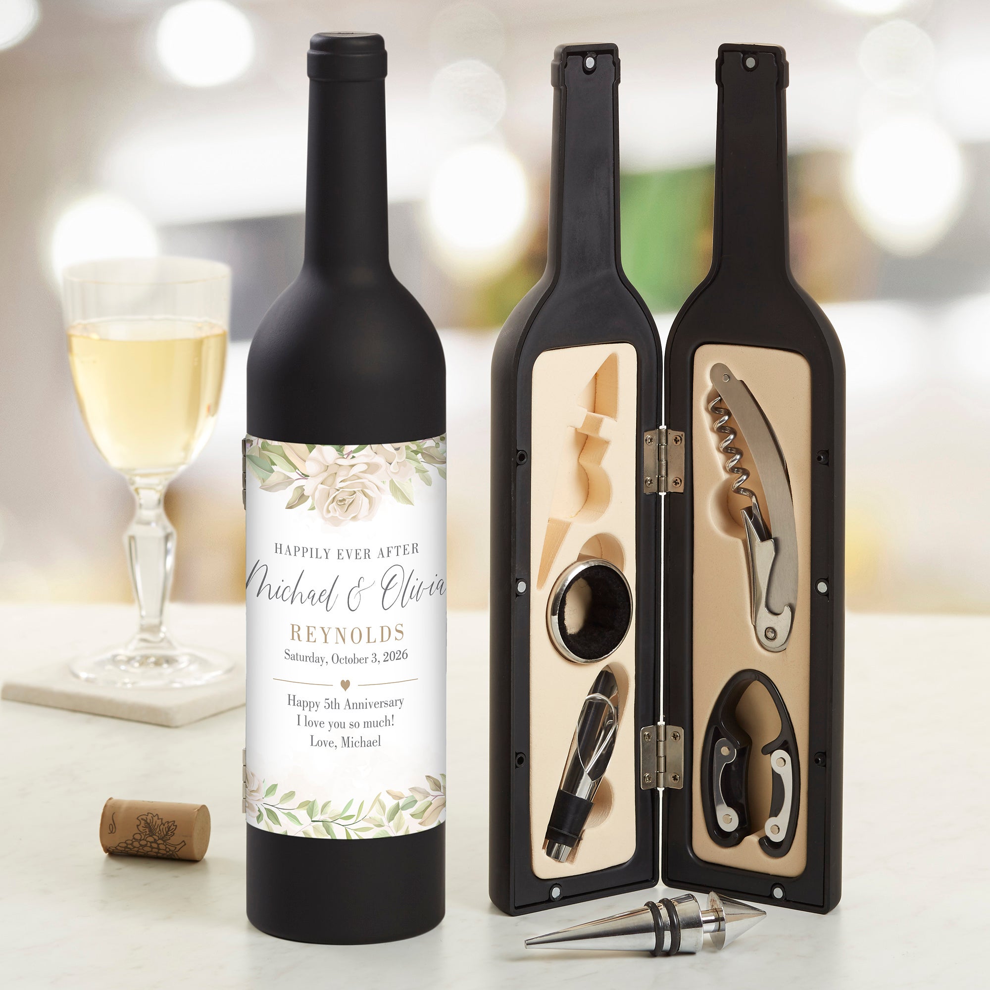To celebrate your special day, our Floral Anniversary Personalized Wine Accessory 5pc Kit is the perfect gift and makes a great keepsake.