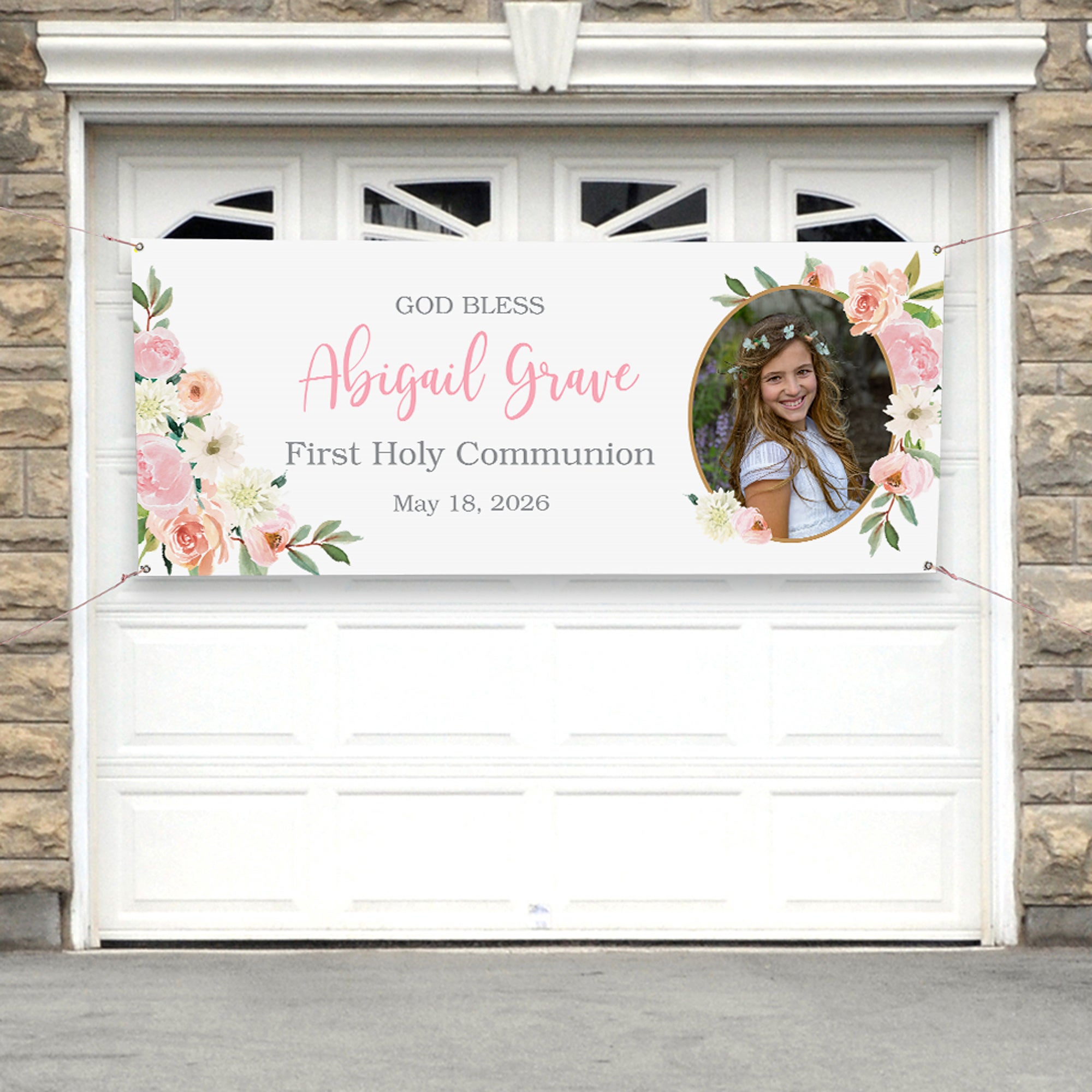 Celebrate a momentous occasion with our Floral First Communion Personalized Banner. This elegant banner is the perfect backdrop for a cherished First Holy Communion celebration, adding a touch of grace and beauty to your special day.