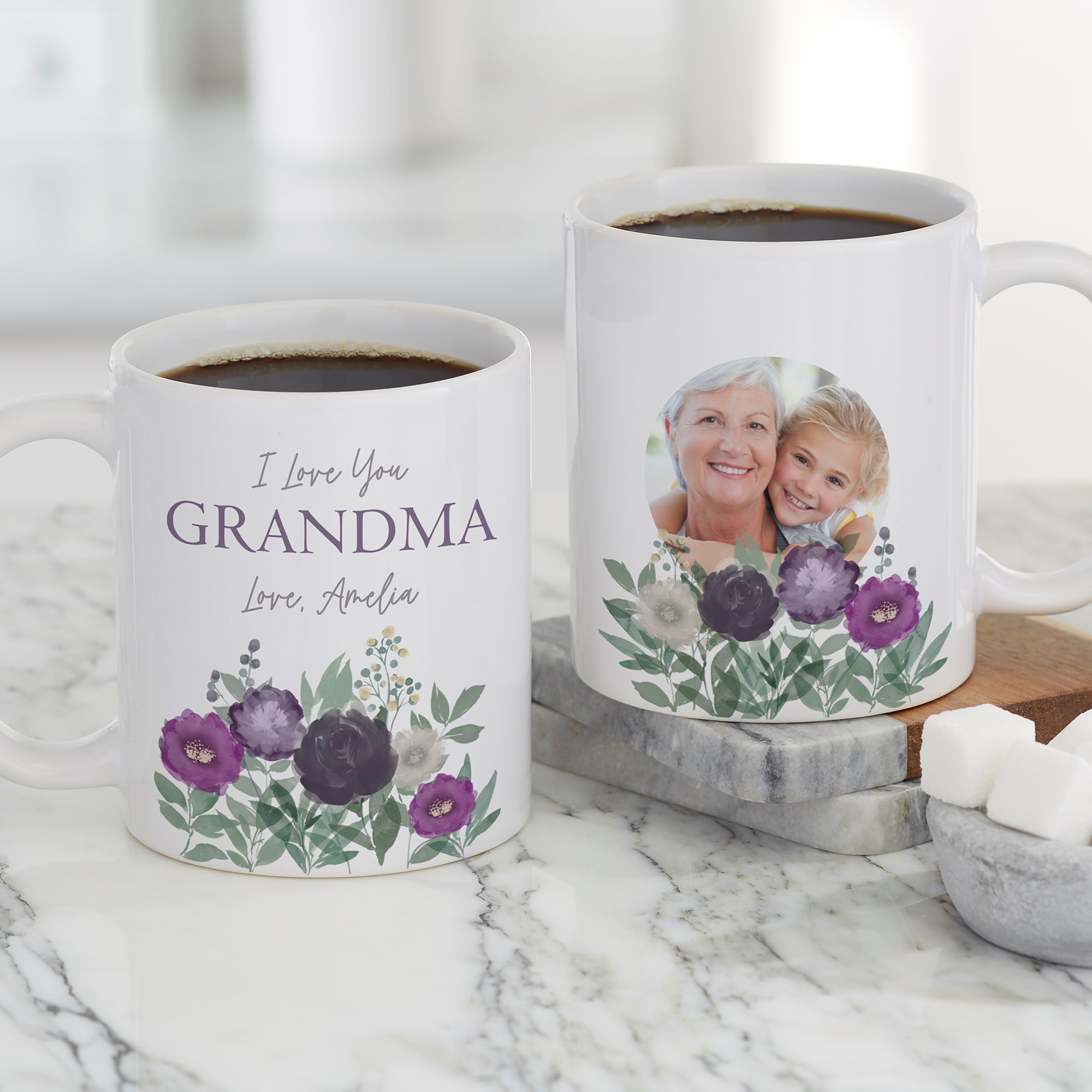 The Floral Love For Grandma Personalized Photo Coffee Mug is perfect for sipping her favorite beverage.