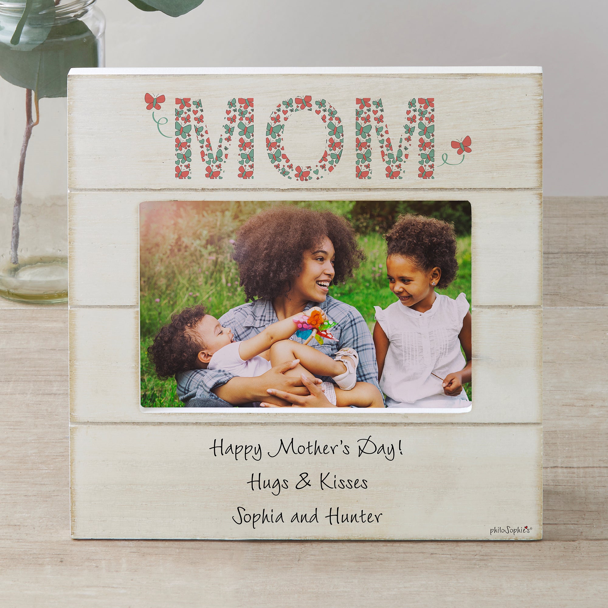 Show her how much she is loved with our exclusive Butterfly Mom philoSophie's® Personalized Shiplap Picture Frame. Our rustic, farmhouse inspired frame adds a beautiful personalized touch to any home.