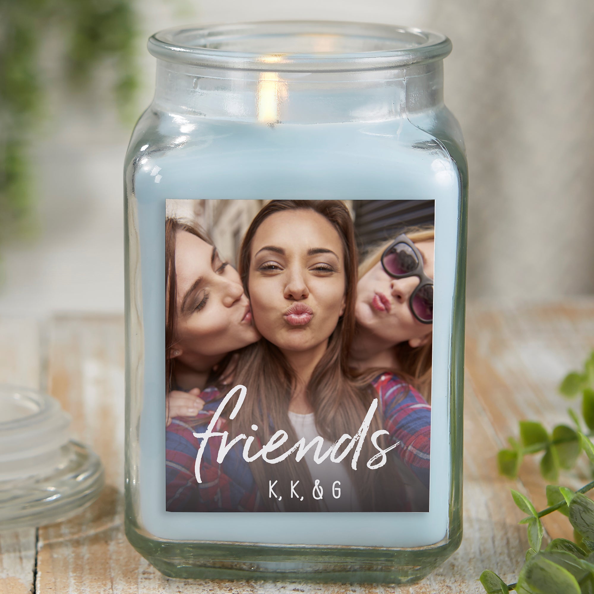 The Friends Photo Personalized Scented Glass Candle Jar is the perfect way to display a special photo in any room in your home. Every time you light the candle you will be able to see it shine as brightly as the smiling faces that are looking back at you.