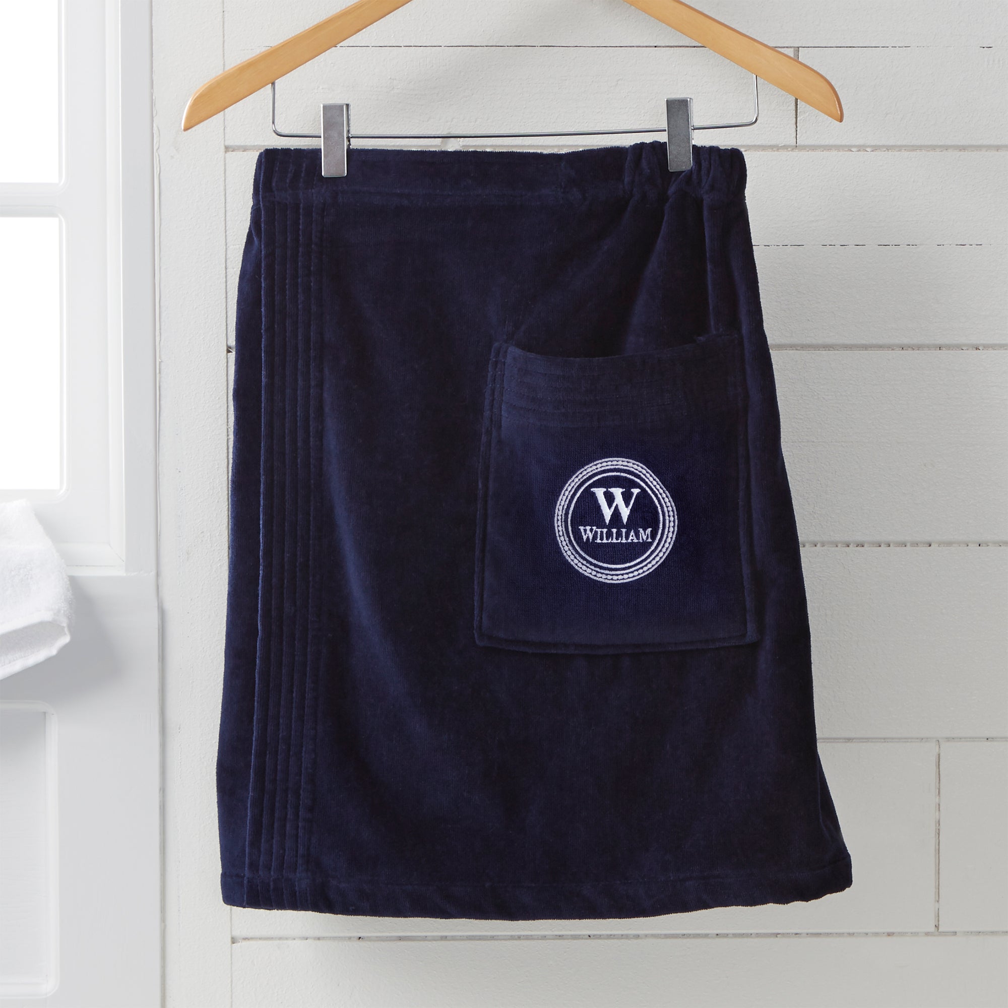 Wrap him in comfort and luxury after a shower or just lounging with our Gentleman's Seal Embroidered Men's Navy Velour Towel Wrap. He'll be wrapped in ultimate, manly comfort in signature style.