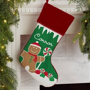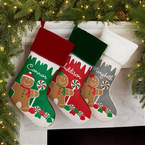 Make a whimsical and warm addition to your holiday home this year and every year with our Gingerbread Characters Personalized Christmas Stockings.
