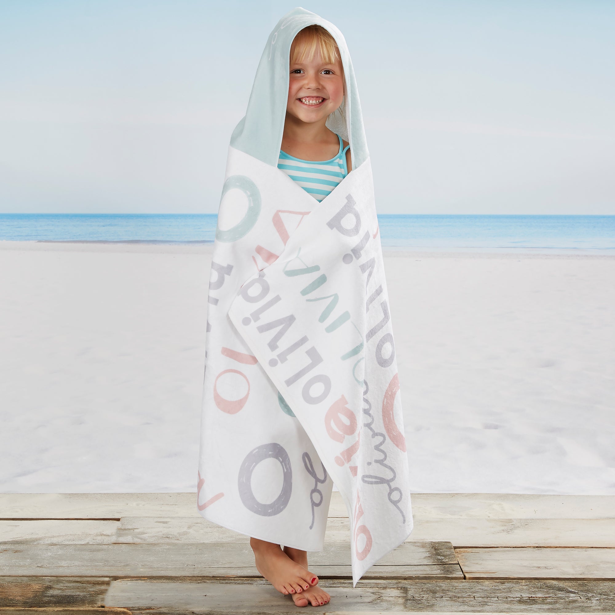 This personalized kids hooded towel makes for a fun bath piece for home, beach or pool side.