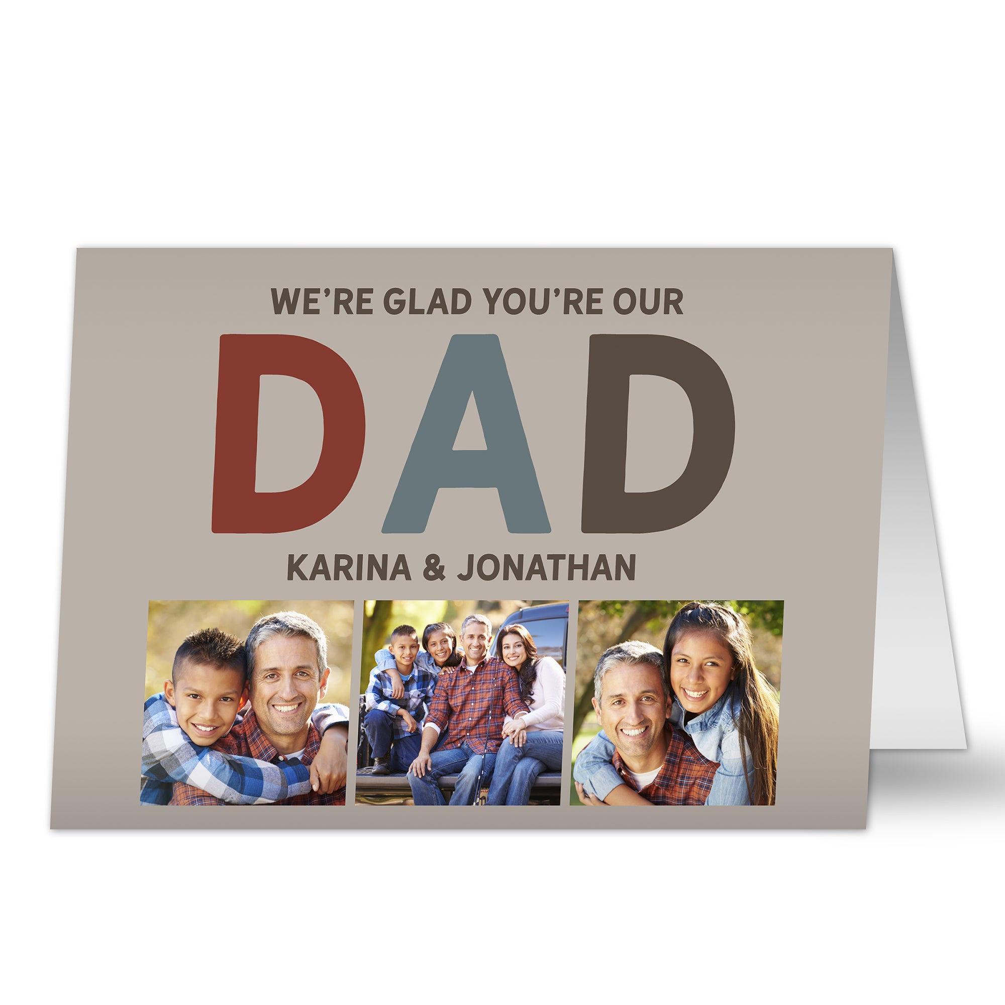 Celebrate your dad and let him know he's loved with our Glad You're Our Dad Personalized Greeting Card! This card features three sweet photos of your choice, making a perfect finishing touch to any Father's Day or birthday gift.