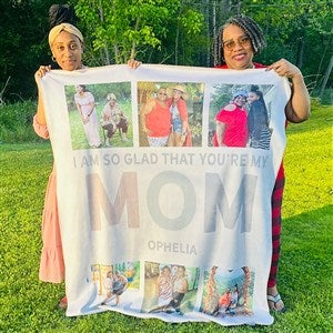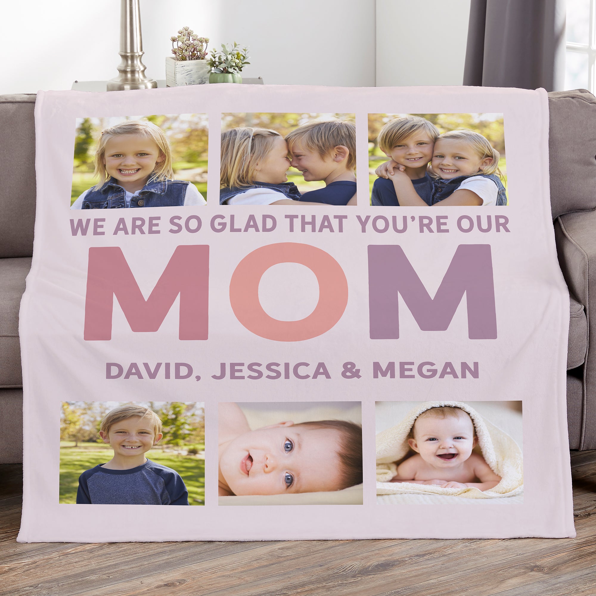 They will relax surrounded by the faces of those they love with our Glad You're Our Mom Personalized Blanket. This custom photo blanket is ideal for outdoor sporting and leisure events year round, watching their favorite TV show, or for snuggling indoors with a good book.