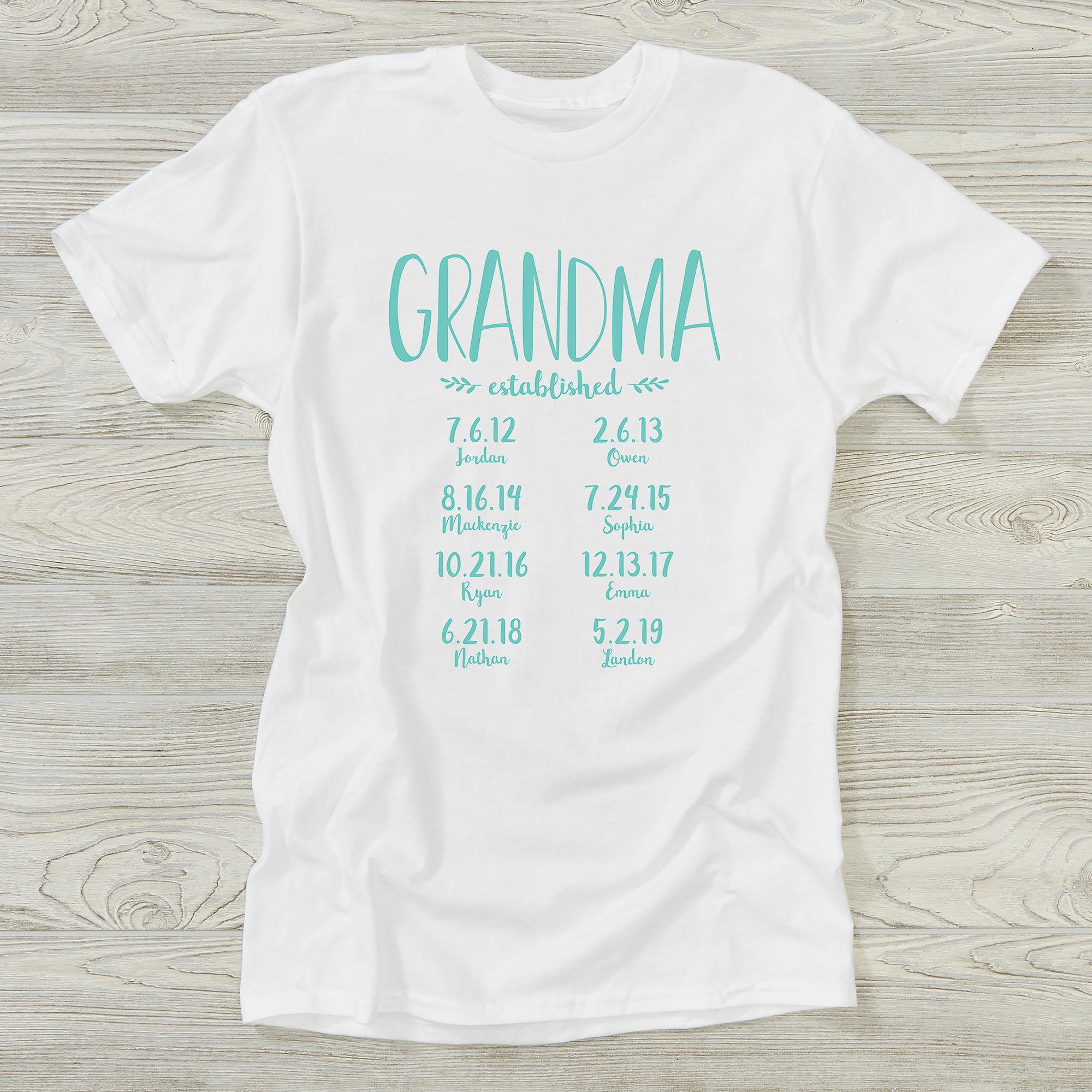 Let the world know how many grand-kids you have by proudly wearing our Established Grandma Personalized Adult Shirt. The perfect gift for Grandma.