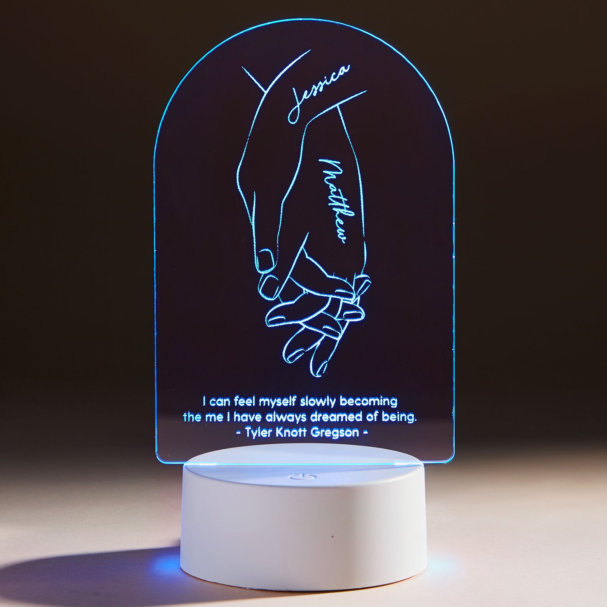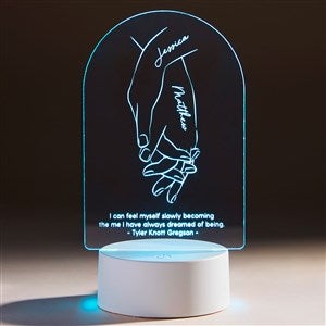 The Hand in Hand Personalized LED Sign is a fun keepsake to display your love and affection. The laser engraved acrylic sign fits in the LED base and lights up for a unique display on the gift, dessert, or head table.