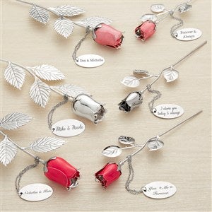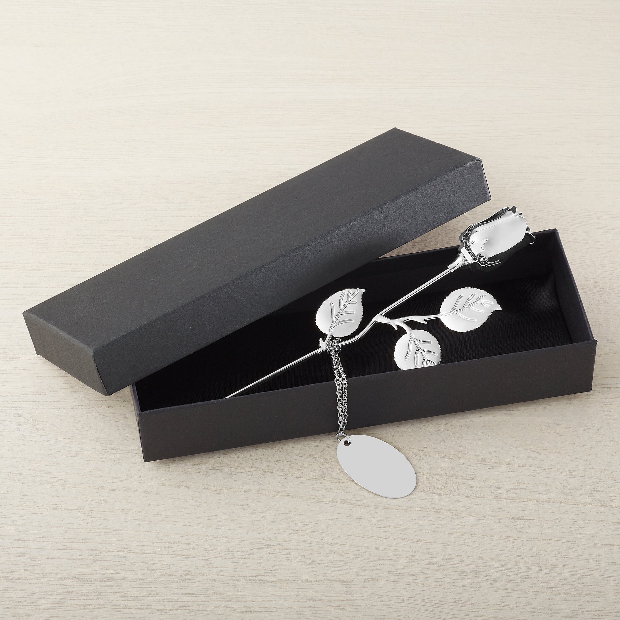 - Keepsake rose and single engraved tag are packaged in a black box, ready for gift giving