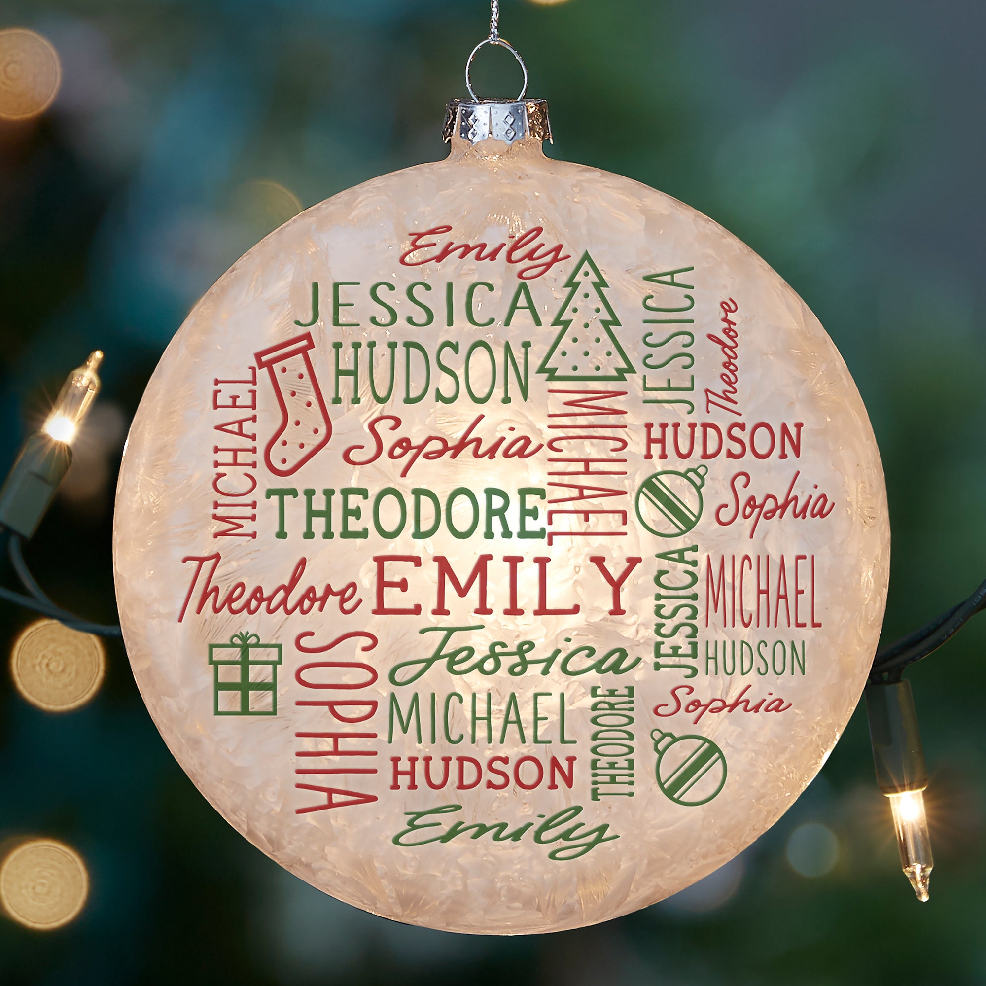 The Holiday Repeating Name Personalized Lightable Frosted Glass Ornament is a unique way to display your family's names. Insert any small bulb Christmas tree light in the back and watch your ornament light up. Whether you use clear or multi-colored lights, your ornament will give a glow whenever your lights are on.