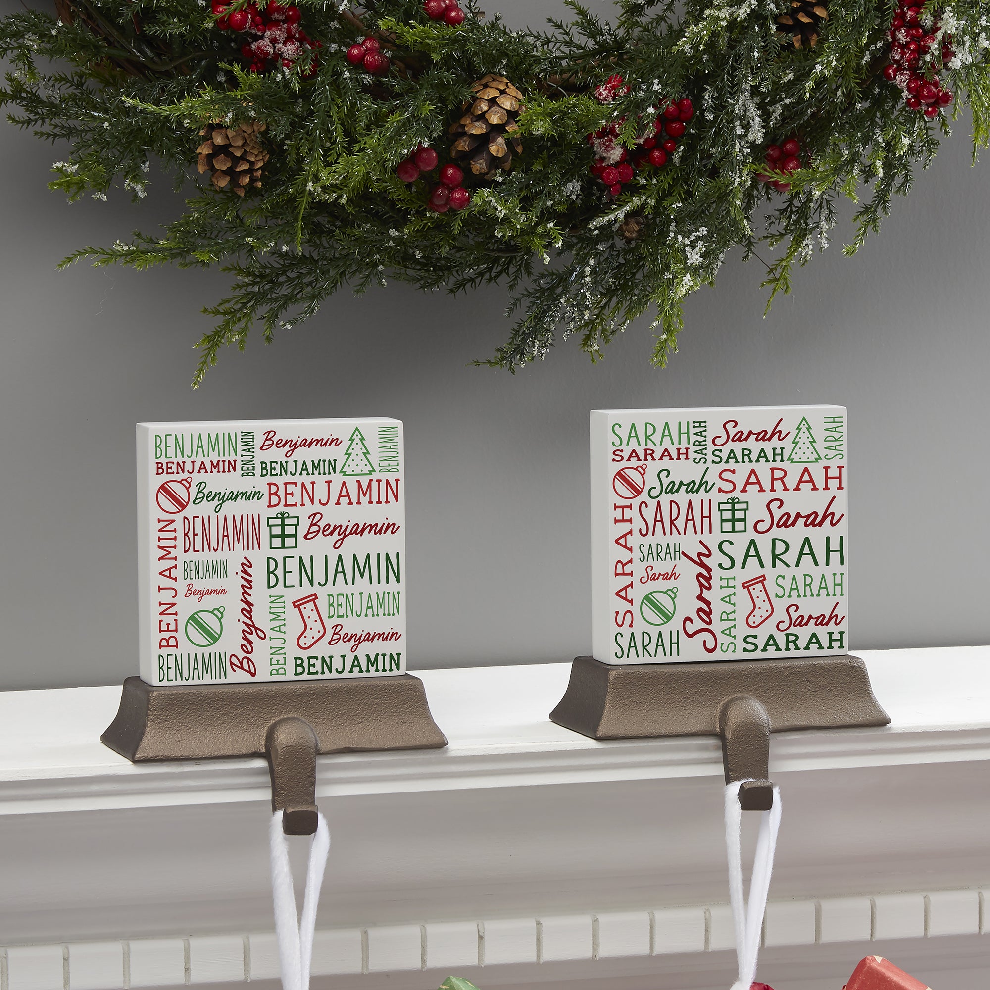 Festively decorate your fireplace mantel with the Holiday Repeating Name Personalized Stocking Holder. Each stocking holder is heavy enough to support the most abundantly-filled stockings without nails or screws that could damage your mantel.