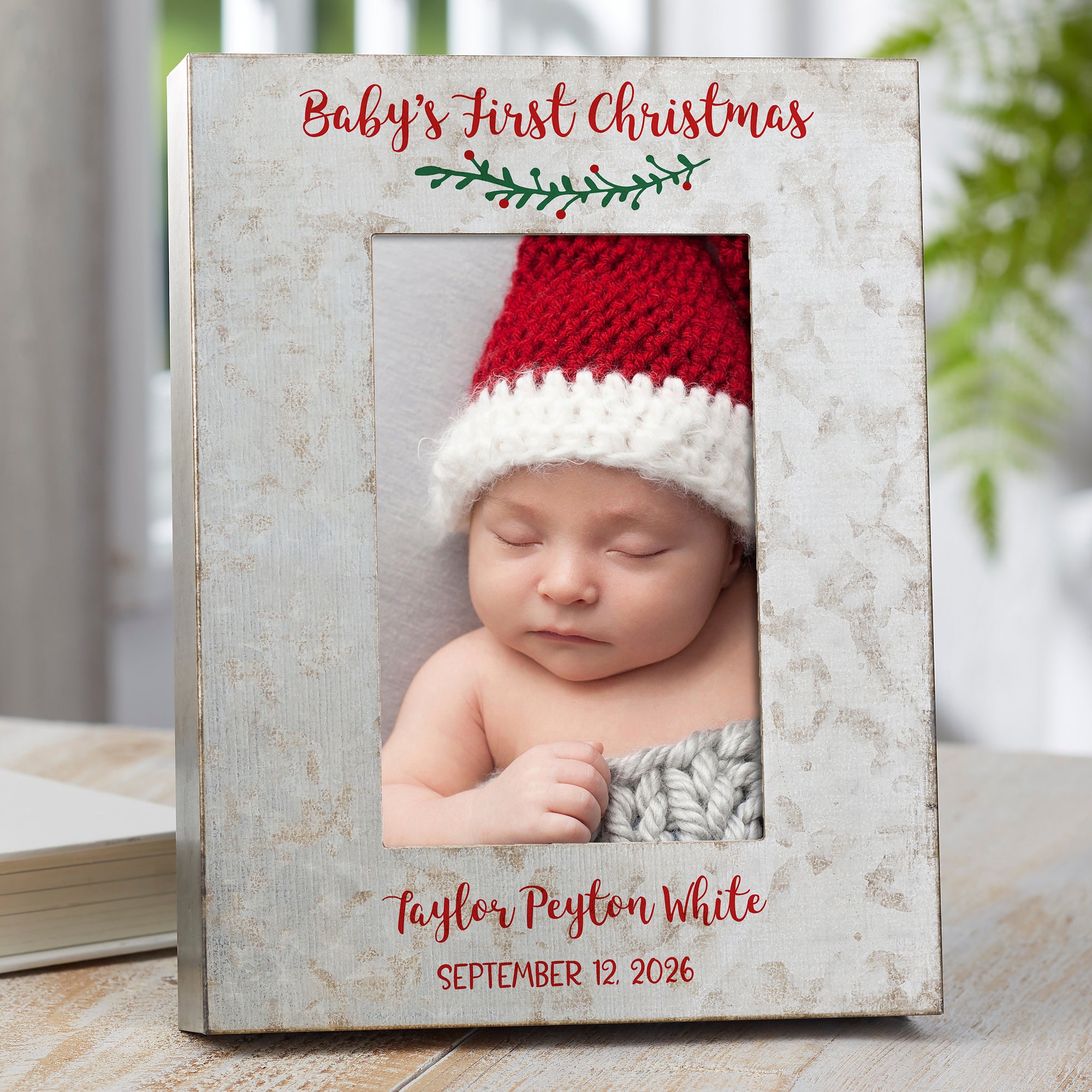 The Holly Branch Baby's First Christmas Personalized Galvanized Metal Picture Frame is the perfect shelf décor piece to add a rustic look to any room in your home. Mix and match sizes to create a beachy shelf display