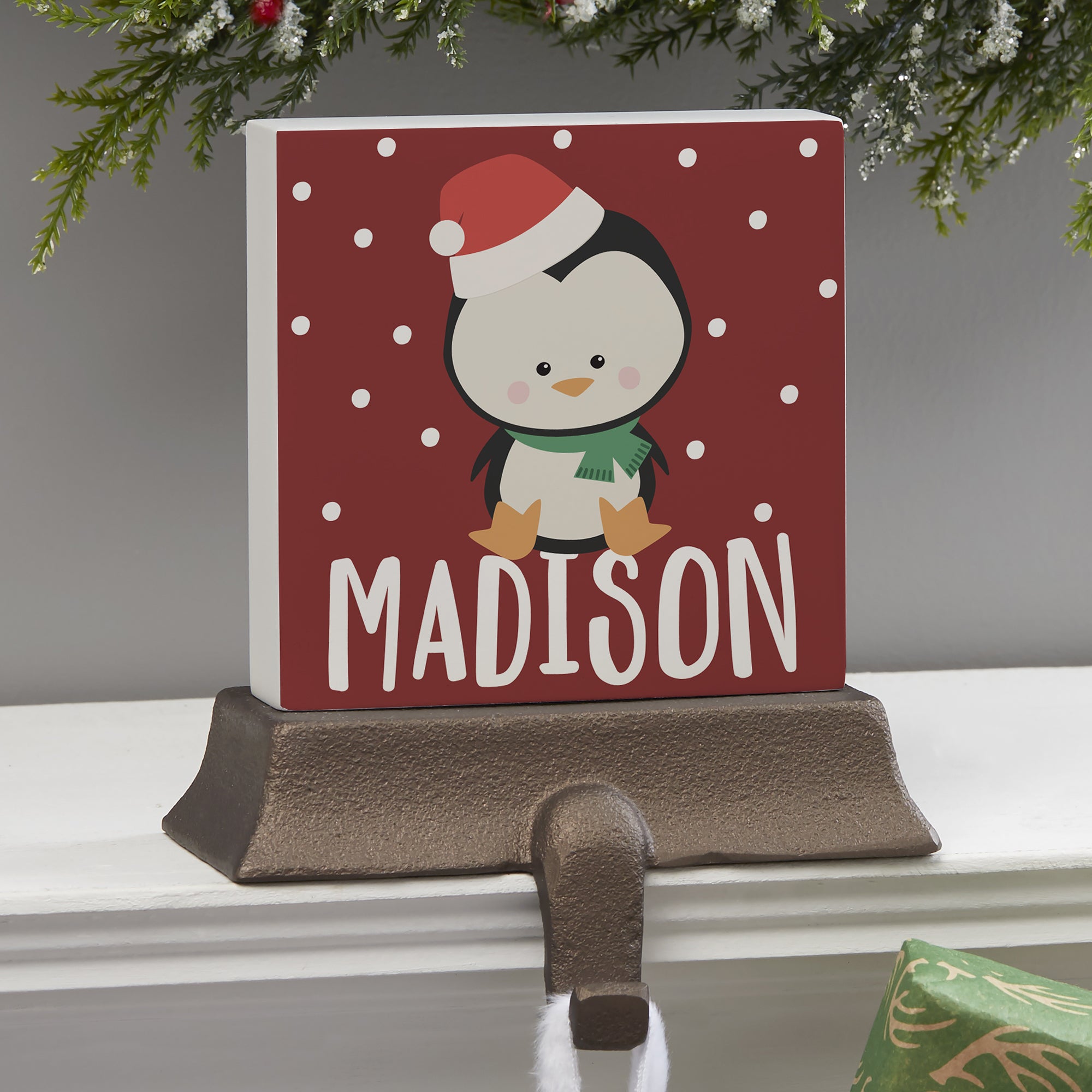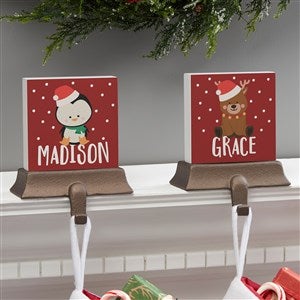 Festively decorate your fireplace mantel year after year with our Holly Jolly Characters Personalized Christmas Stocking Holder. Each stocking holder is heavy enough to support the most abundantly-filled stockings without nails or screws that could damage your mantel.